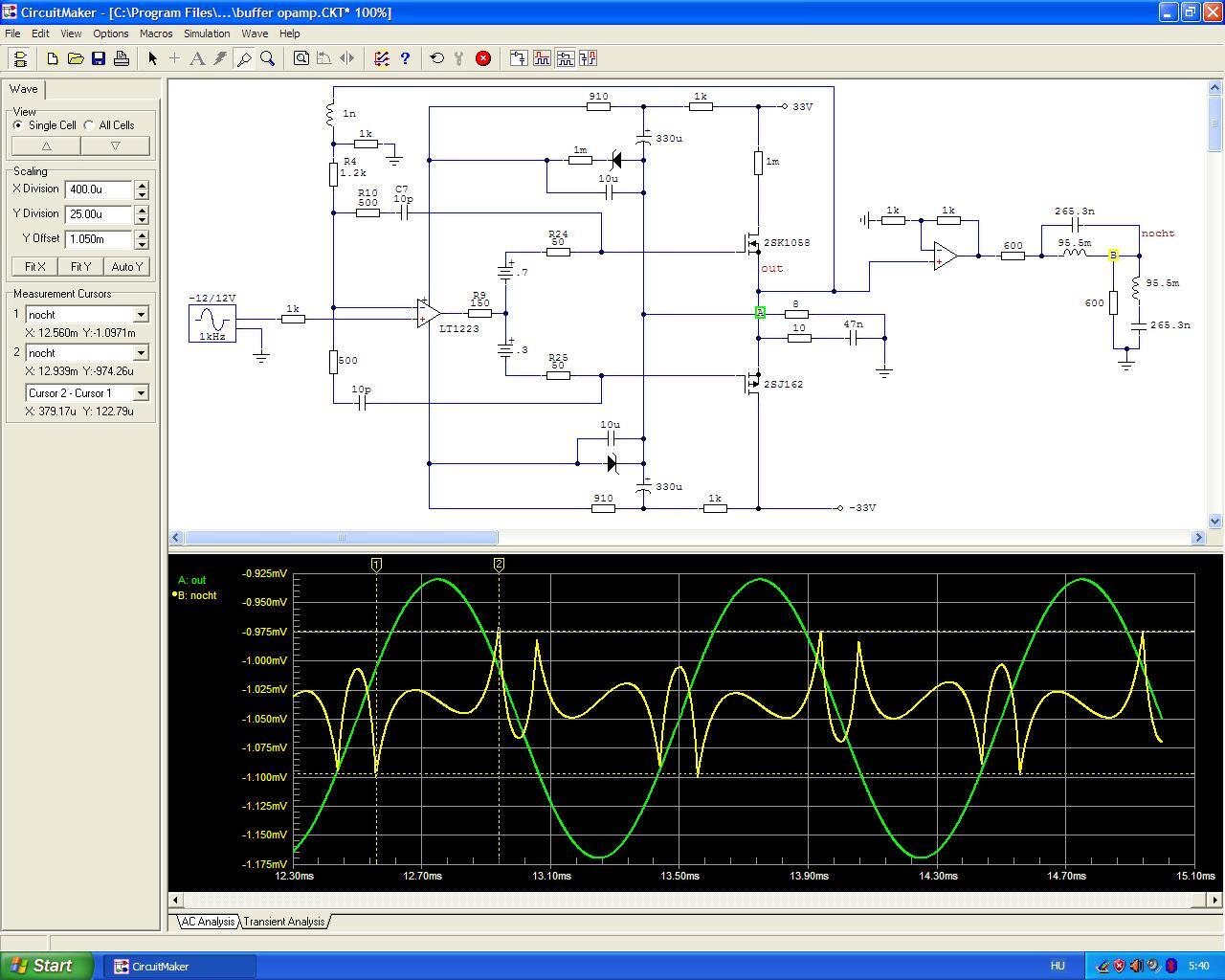 Jött egy ötlet, és nekiálltam szimulátorban játszani egy kicsit, földelt kimenetű erősítővel. Az eredmények és a kapcsolás annyira megtetszettek TG barátomnak, hogy ketten is rászántunk órákat a további finommításra, és már meg is tervezte a prototípushoz a nyákot (bocs hogy a rajz egyelőre nem látszik) .