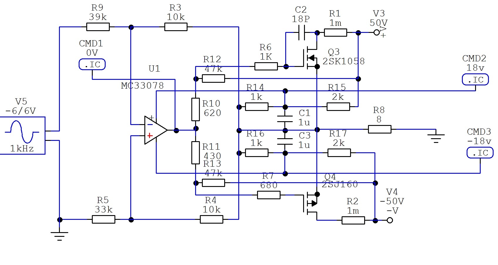 Meglátjuk, hogy a gyakorlatban milyen lesz. A nyugalmi áram 30mA körüli. Szándékosan kapcsolófet-ek vannak a végén, mert hajtott a kíváncsiság, hogy mit lehet ilyenekkel elérni. Nagyobb frekvencián látszik, hogy kicsit kompenzál az opamp a két fet közötti átváltáskor (az A-B osztály határán) de a kimeneten ebből szinte semmi sem látszik - kérdés, hogy majd a gyakorlatban is tudja-e ezt... A hozzászólás módosítva: Okt 23, 2025