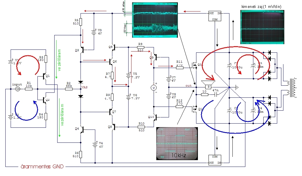 Elég az érzelgősségből, vegyük komolyan. A bemeneti GND csillagponthoz menő vezetékét árammentesnek jelölted, de valójában nem az. A Q1, Q2 kollektor árama ami az R5, R6 áramát szipkázza el a Q3, Q4 elől, a GND vezetékbe folyik. Az elemekből csak a bázisáram származik. Lehetőség van a Q3, Q4 differenciál módú meghajtására, aminek következtében valóban árammentessé tehető az említett vezeték, de ez további tranzisztorokat igényelne. Ez viszont lehet hogy több rosszat hozna mint hasznot. Ezt le is fogom rajzolni.