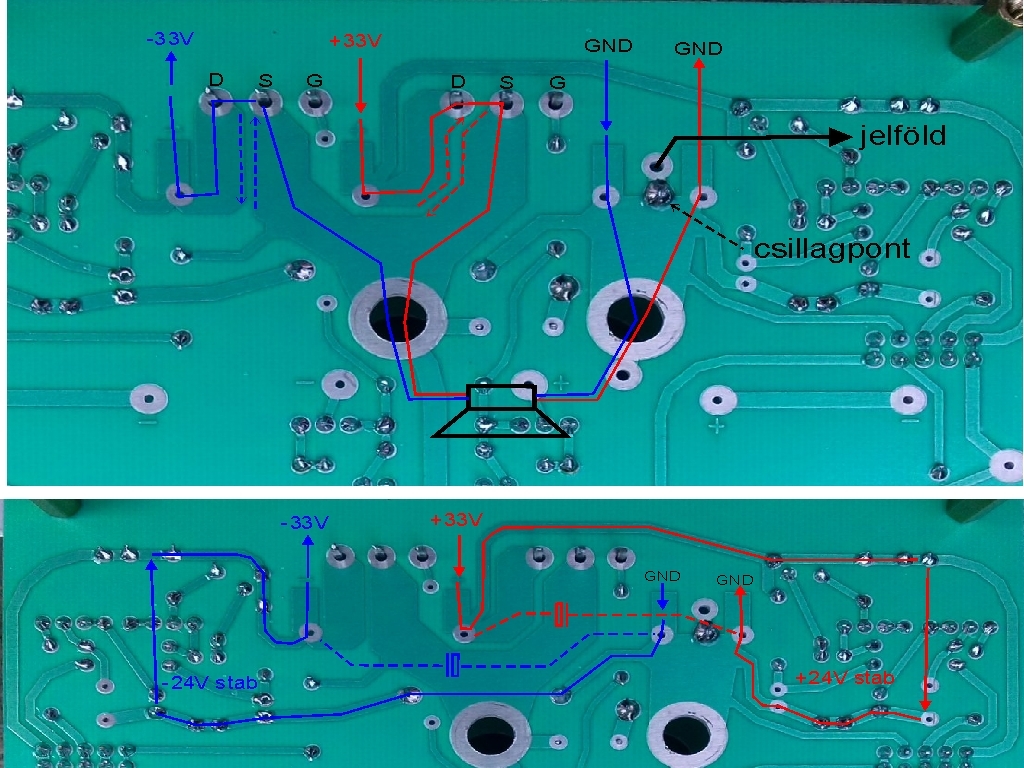 Hát igen... itt jön a luftballon elmélet. Ha differenciál erősítős a bemeneti fokozat akkor javul a linearitása, de a visszacsatolókör árama folyik a jelföldön. A jefölddel meg el kell menni valahogy a csillagpontig és az mindig messze van. Valamelyik fólia szakasz mindig nő a másik rovására. Vagy még jobb nyákot kell tervezni. El lehet ezzel molyolni tavaszig simán.