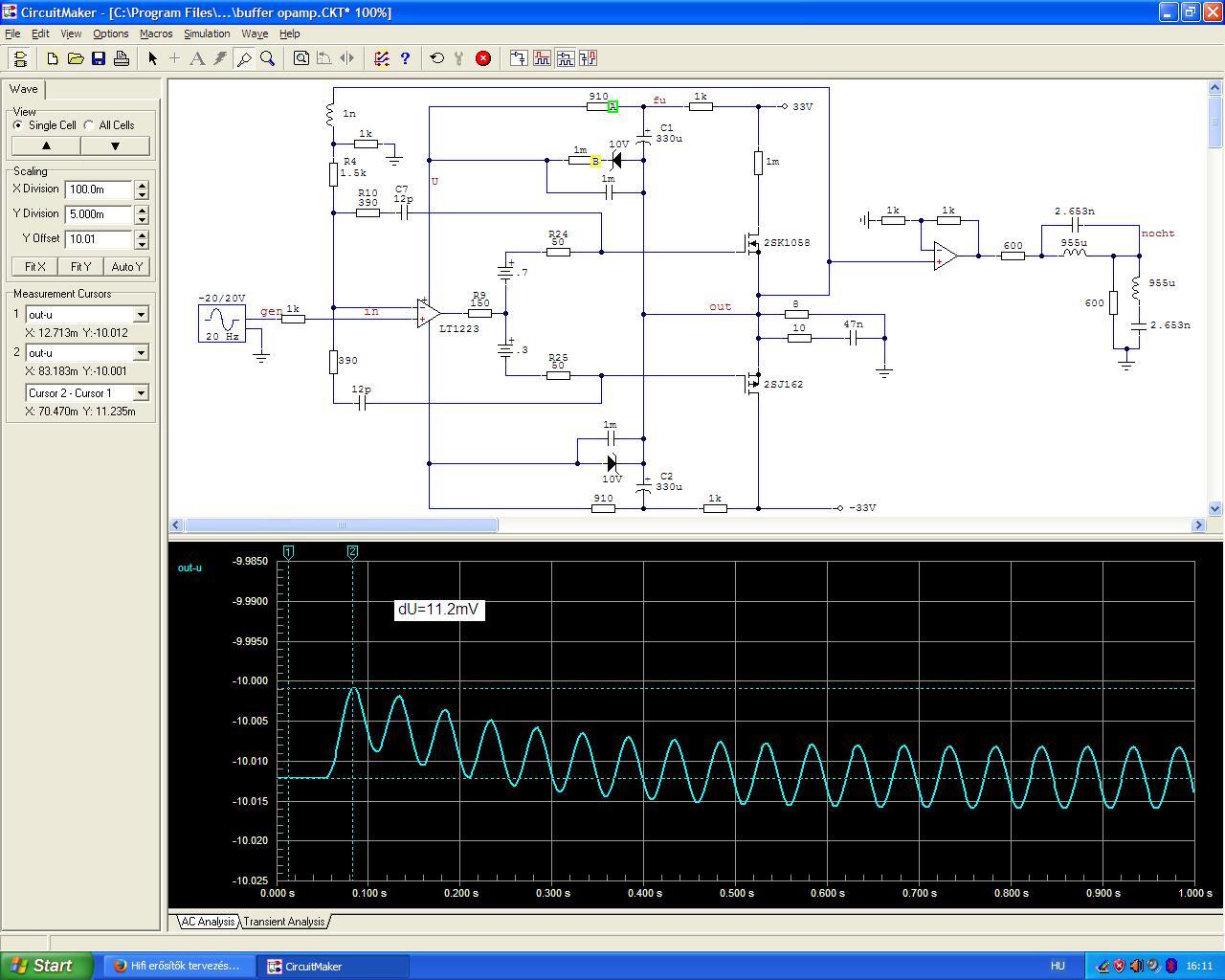 LT1223-ra, mert ez elég gyors (100MHz, 2000V/us) van belőle egy csomó a fiókban, újra lehet kapni, viszonylag olcsó. Nem olyan rossz a szimulációk eredménye. Mindössze háromszor akkora torzítása (1kHz-en, ugyanakkora hurokerősítés mellett) mint az ideális opampnak, de nyolcszor kisebb mint a tranzisztoros meghajtásnak. Az viszont továbbra is homályos előttem (is), hogy meddig érdemes csökkenteni a THD-t. Talán akkor érdemes opampot használni ha nyújt valami más előnyt is a BJT-hez képest. Arra voltam kíváncsi ezzel a sok szimulációval, hogy van-e valami hátránya/előnye a feszültség utánhúzásnak a fix táphoz képest. A Nocht kimenetén az látszik, hogy a keresztezési torzítás alig változik, viszont utánhúzva kisebb a páratlan harmonikus torzítás. Nyilván, mert kisebb kivezérléssel dolgozik az opamp (csak a torzítást kell kompenzálnia). A fázistartalék 9 fokot romlik - pont amiatt, hogy kisebb jelszinten dolgozik, de ezt át/ki lehet kompenzálni). A futási időt azért mutatom zárthurokban, mert ezzel egyszerűen ki lehet mutatni ha belső fázistolás átlépi a -90 fokos bűvös határt. Miért bűvös? Ha a fázistolás nagyobb -90 foknál, a visszacsatolás pozitívvá válik. A torzítást a pozitív visszacsatolás növeli. Az megint jó kérdés, hogy van-e ennek jelentősége a halláshatár fölött egy dekáddal? 76 fokos fázistartalékig túllövésmentes a négyszögjel átvitel. Elvileg ennyit lehet megengedni egységerősítési frekvencián... de a terhelés nem Ohmos, hanem komplex.
