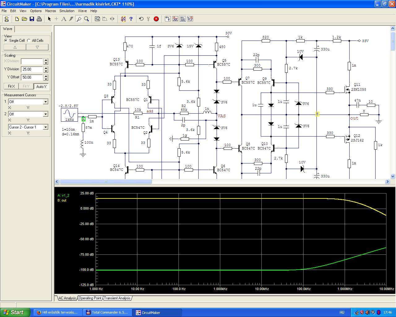 Ha 10u-ról 1000u-ra növelem, 18mV-ról 12mV-ra csökken a feszültségesés. Oda egy SMD tantált gondoltam betenni majdan (ha ilyen lesz) a nagyfrekvenciás zavarjel csökkentése végett. Nem tud a tápfesz (33V) fölé emelkedni a Zener feszültsége, mert a VAS 20V körül klippel. Nem akarom tápfeszig kivezérelni ezt a végfokot, mert nem diszkózni kell. Bőven sok nekem 20W itthonra.