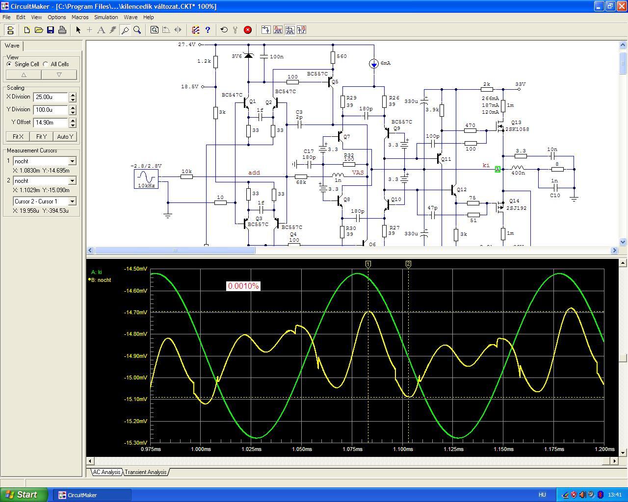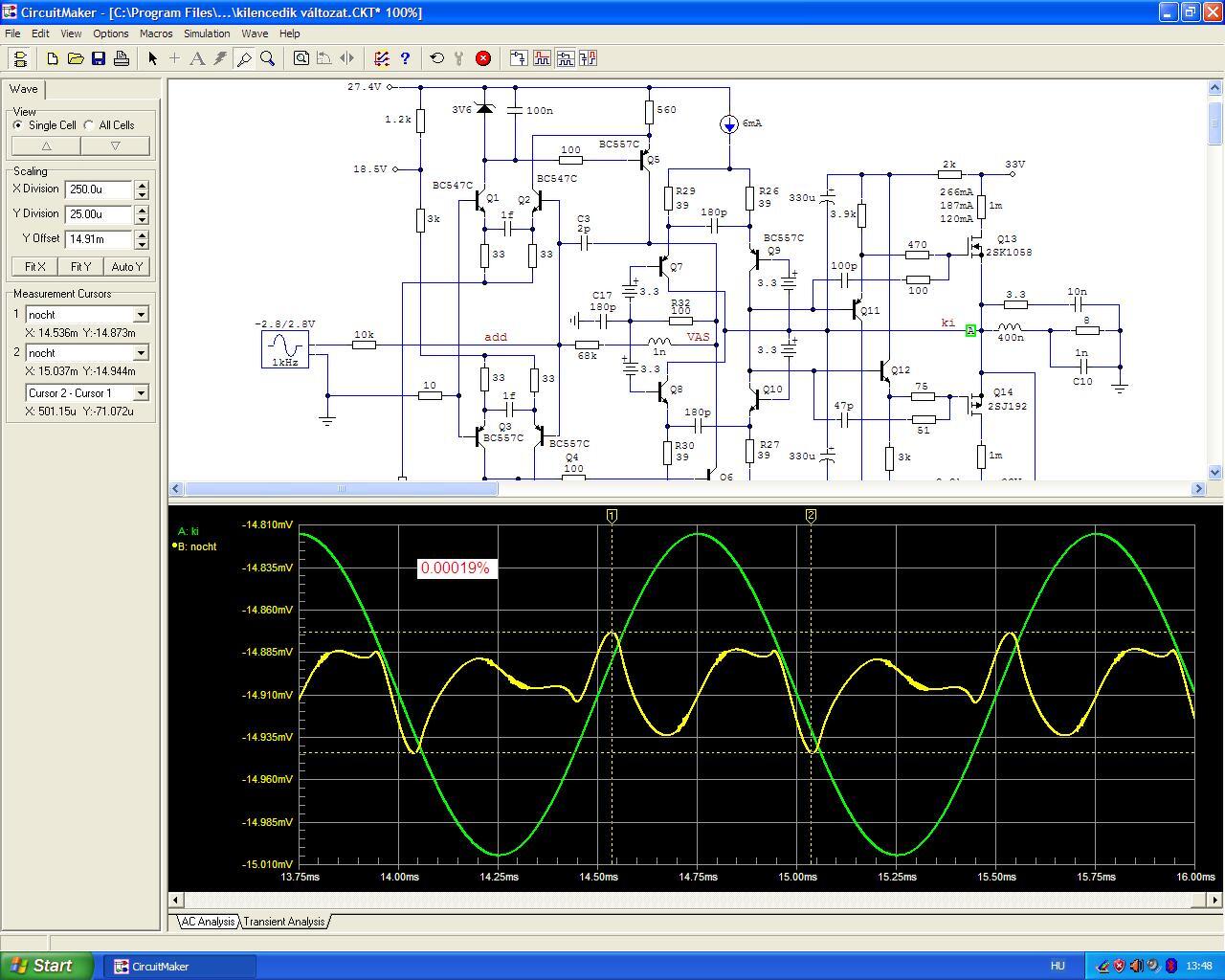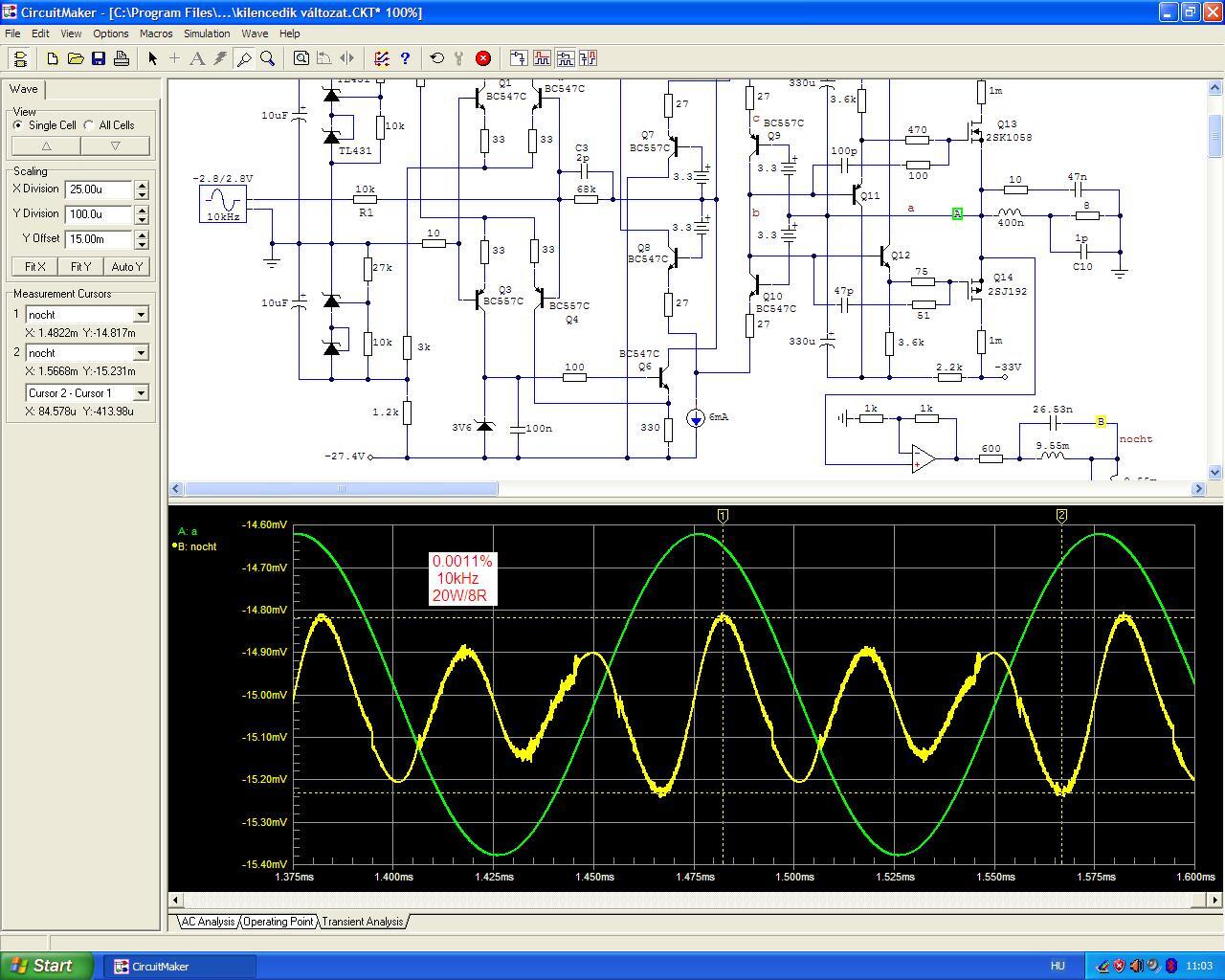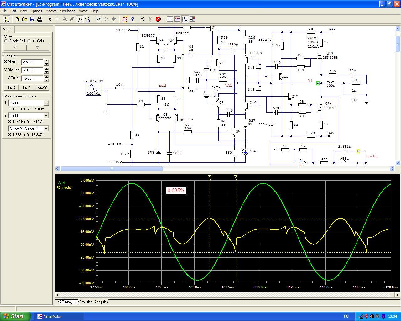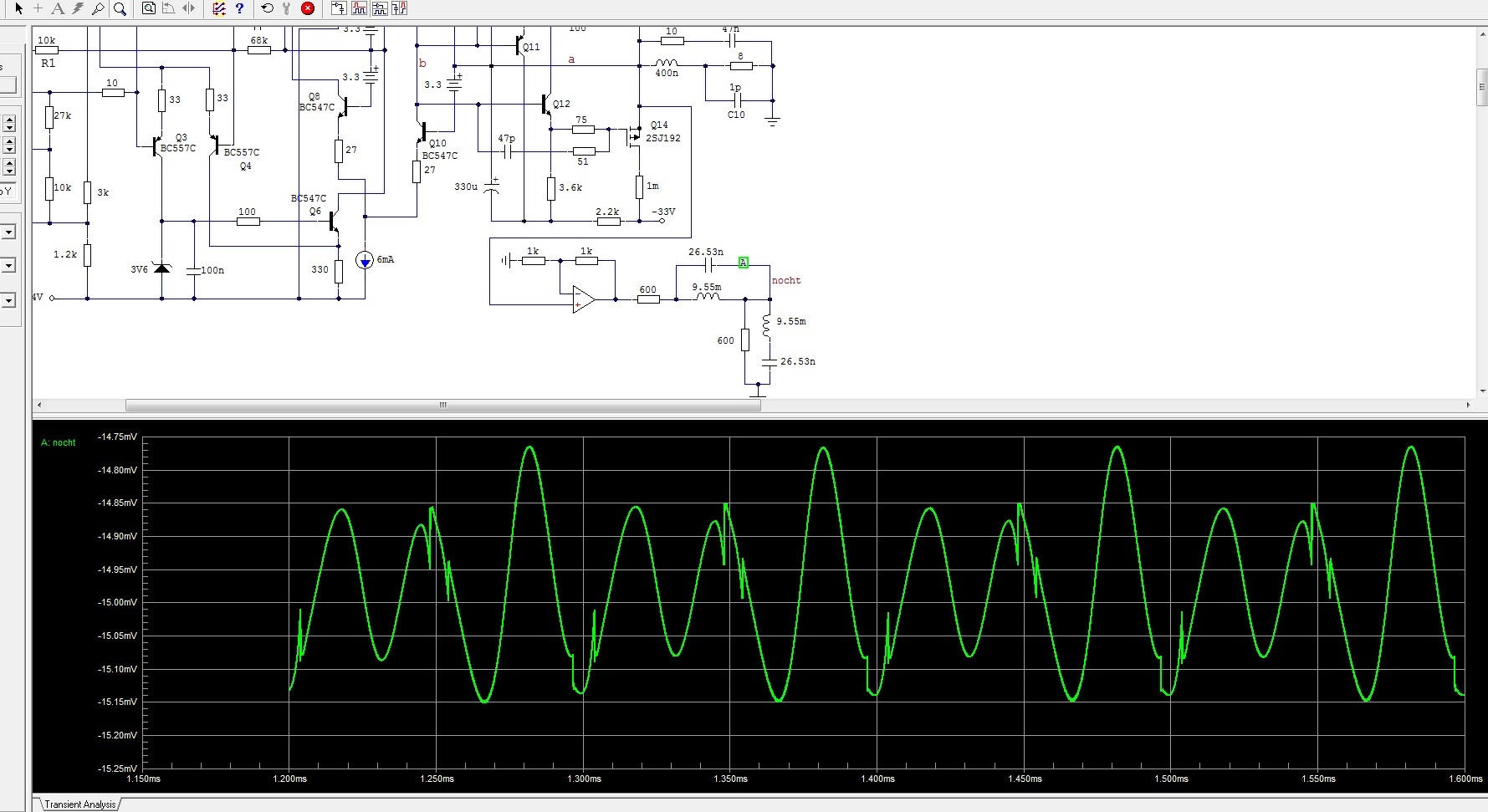 De szerintem ez így is eléggé rendben van (eddig). Érdekes, hogy ha a VAS áramát csökkentem (Q5,6), akkor csökken a THD. Ezt nem teljesen értem miért van így. 380 uV minimumot sikerült eddig elérnem a Nocht kimenetén, most 398 uVpp. Tulajdonképpen ez már csak számháború (brahiból) : ) A hozzászólás módosítva: Nov 22, 2025