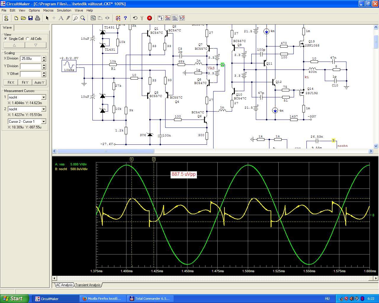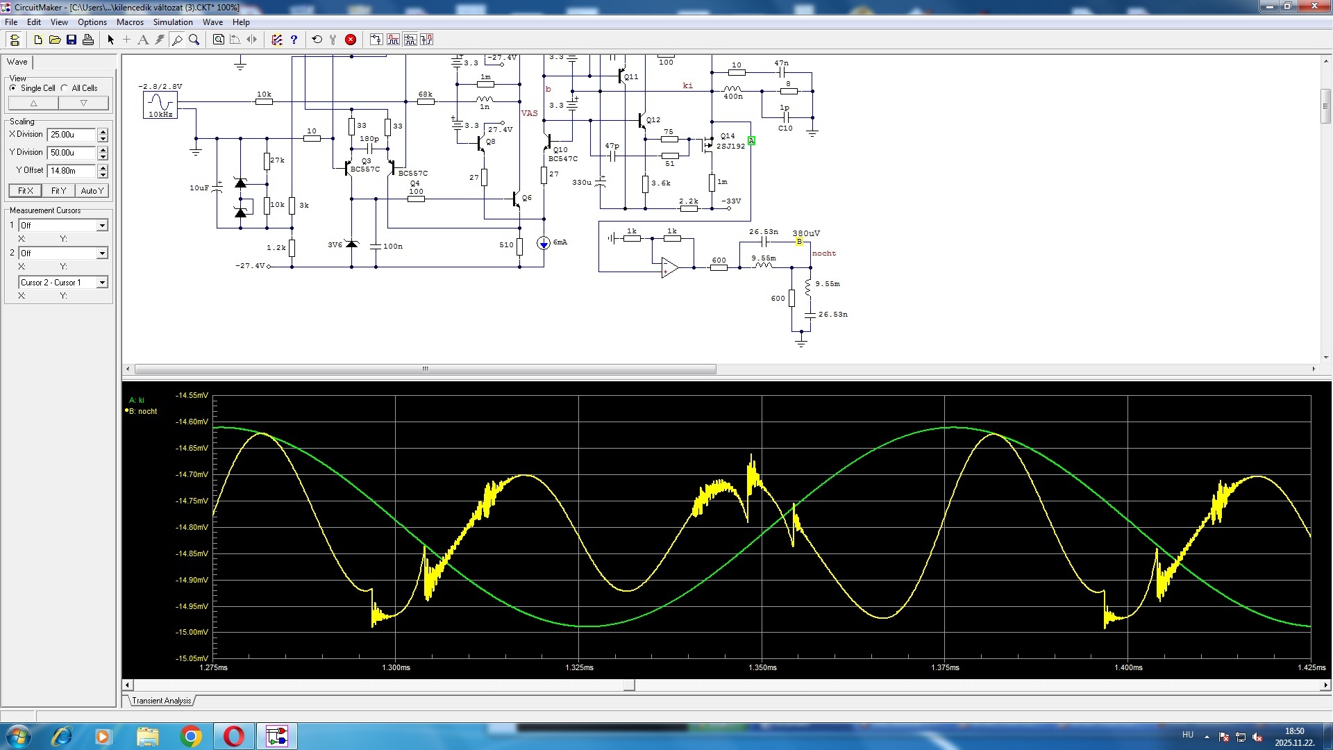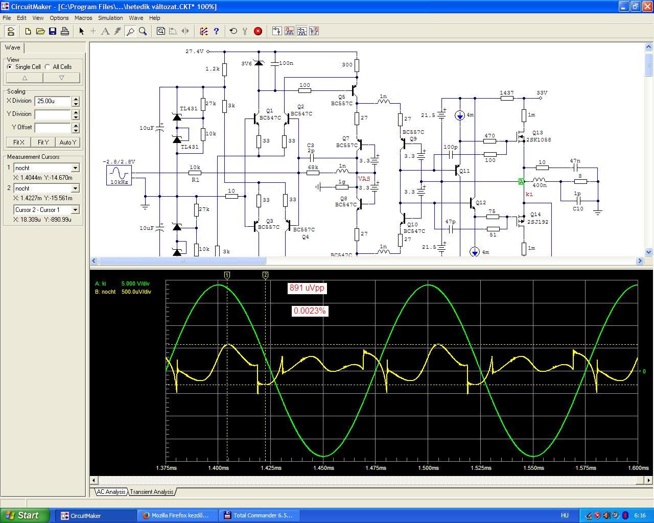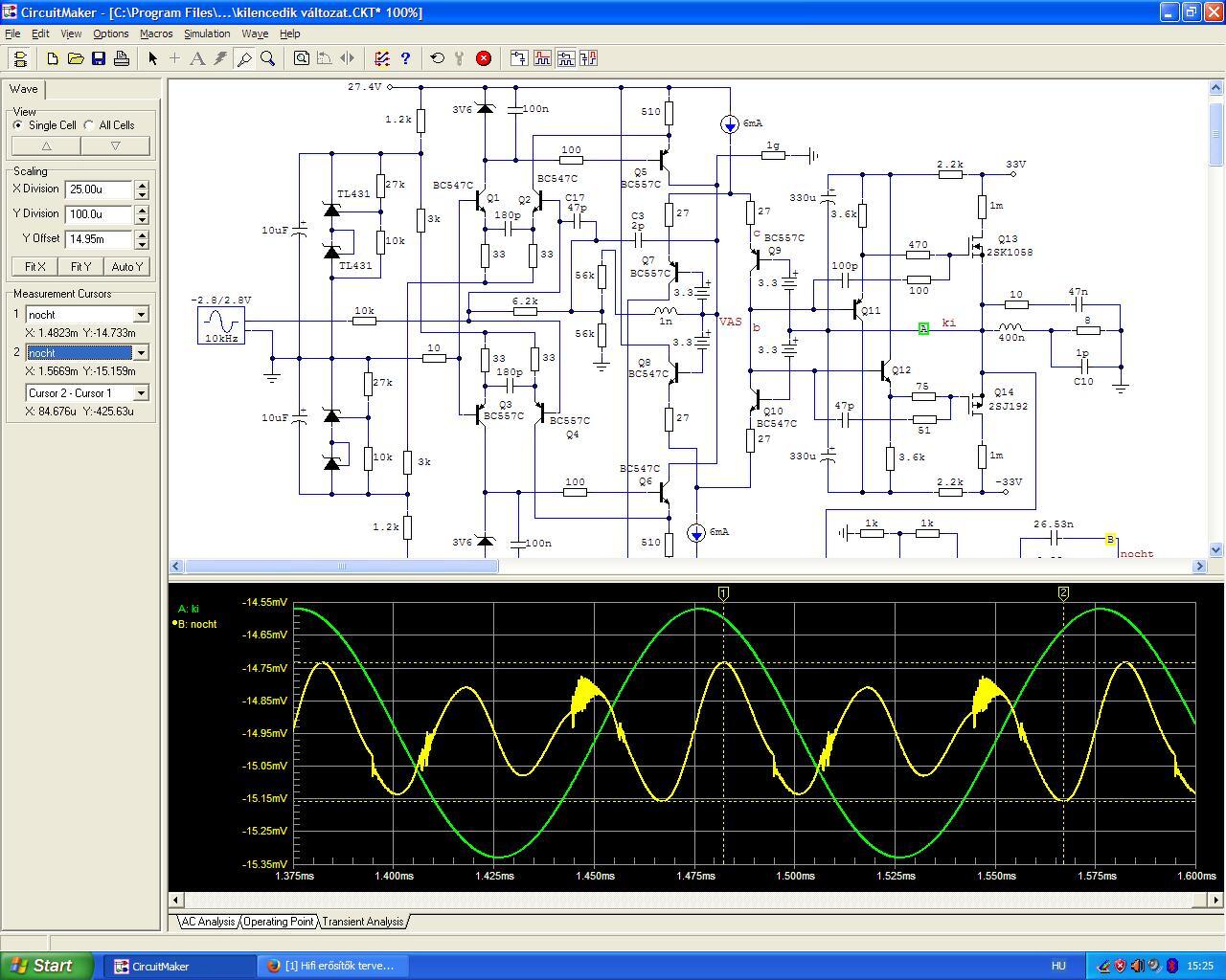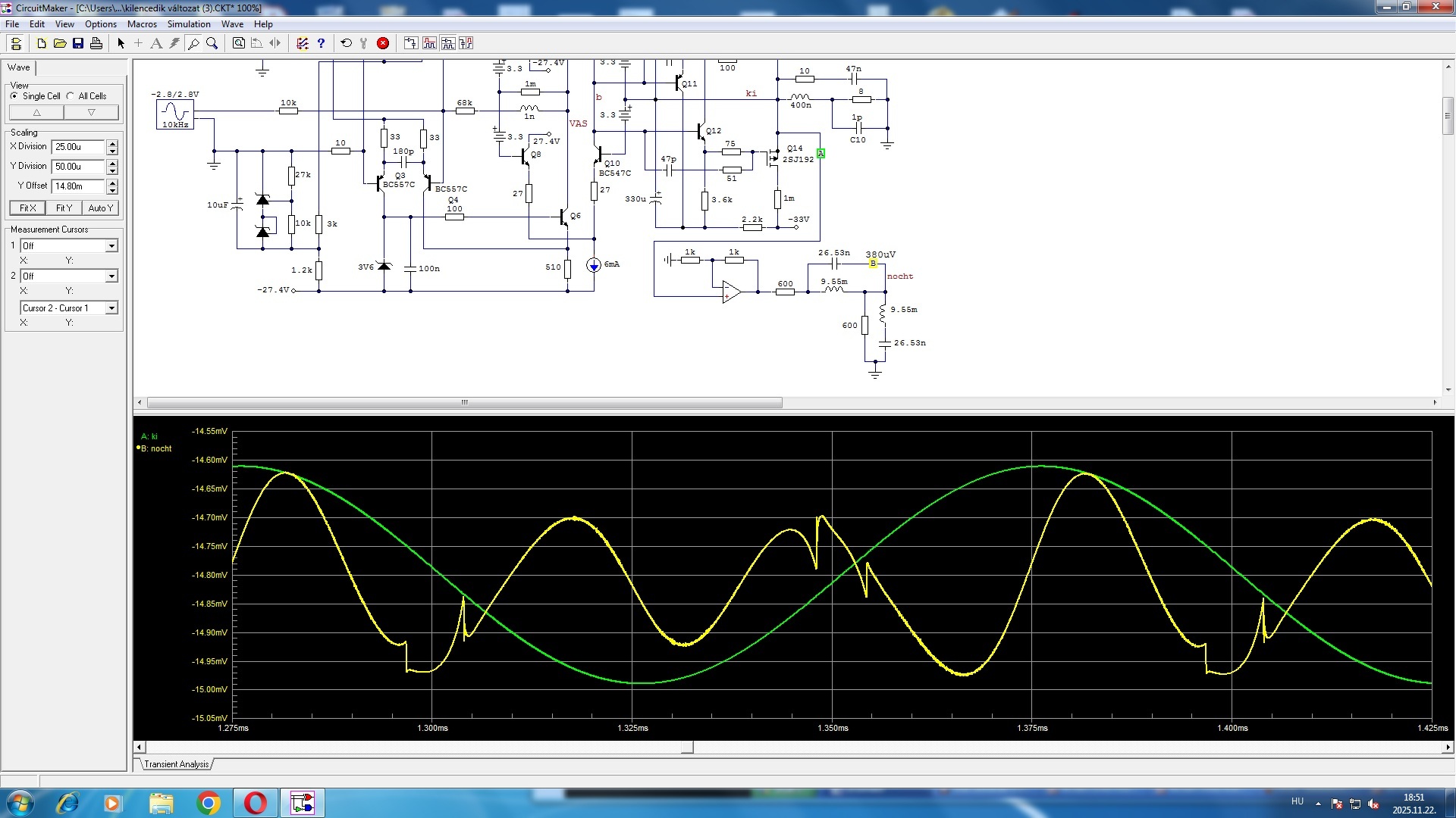 De szerintem ez így is eléggé rendben van (eddig). Érdekes, hogy ha a VAS áramát csökkentem (Q5,6), akkor csökken a THD. Ezt nem teljesen értem miért van így. 380 uV minimumot sikerült eddig elérnem a Nocht kimenetén, most 398 uVpp. Tulajdonképpen ez már csak számháború (brahiból) : ) A hozzászólás módosítva: Nov 22, 2025