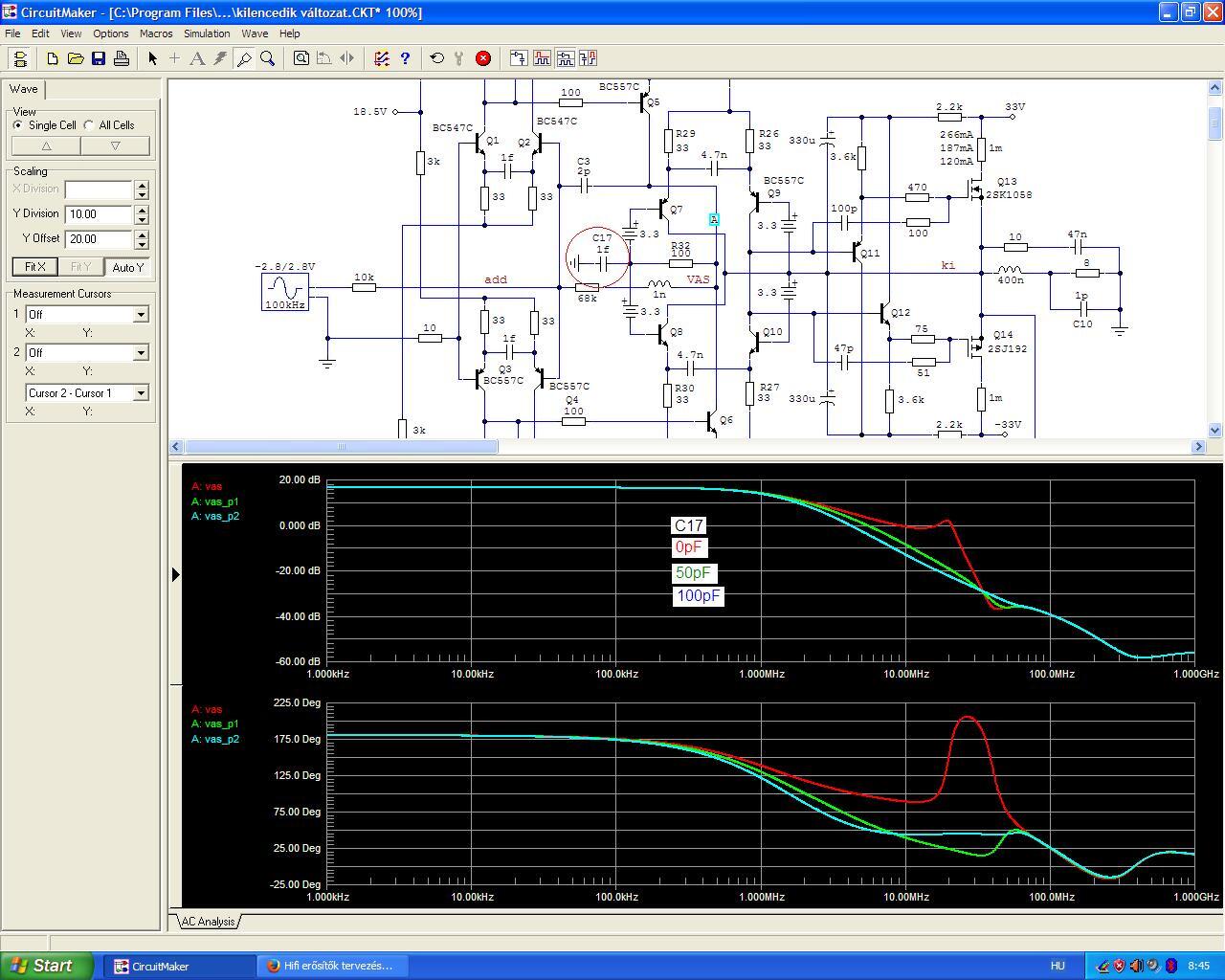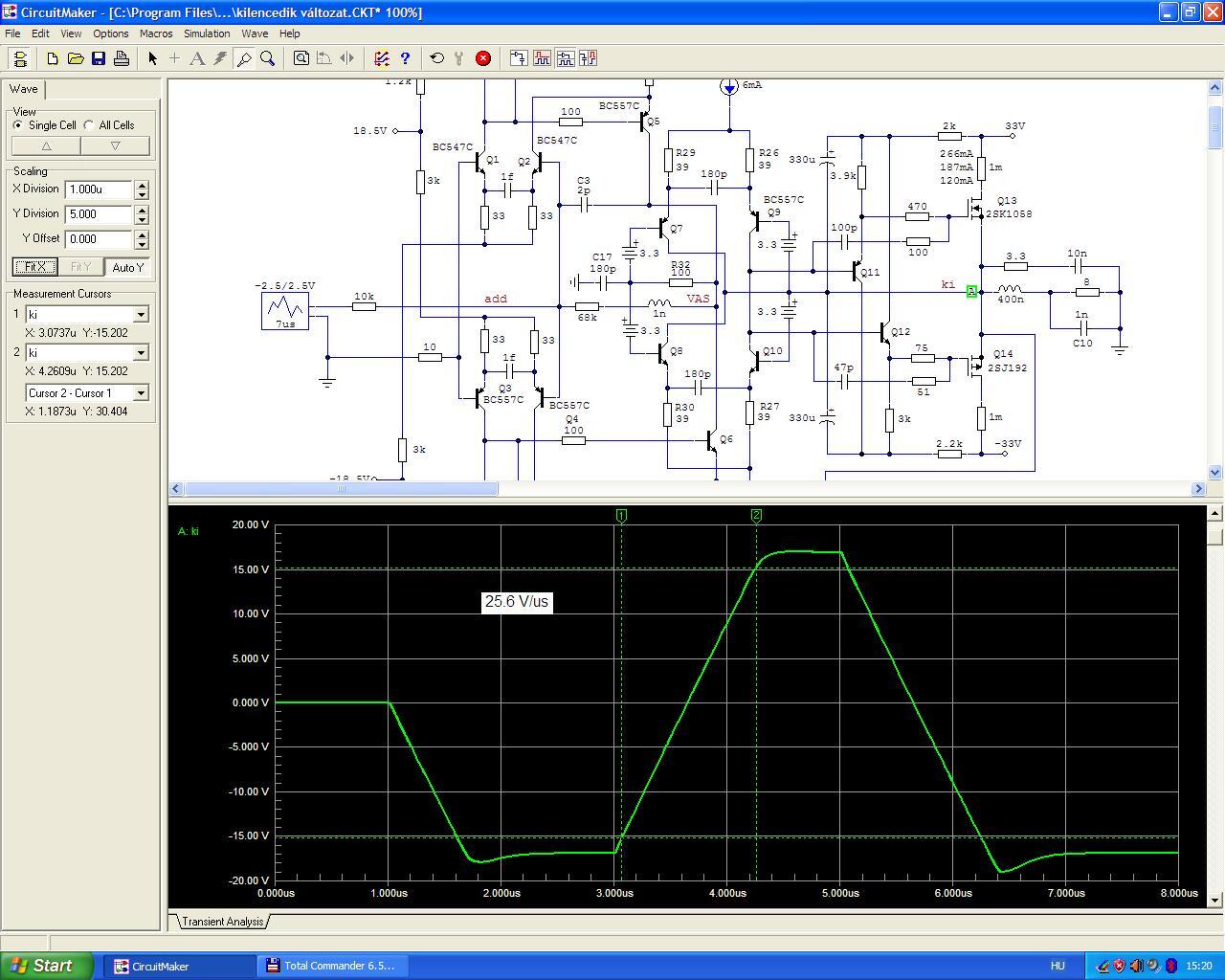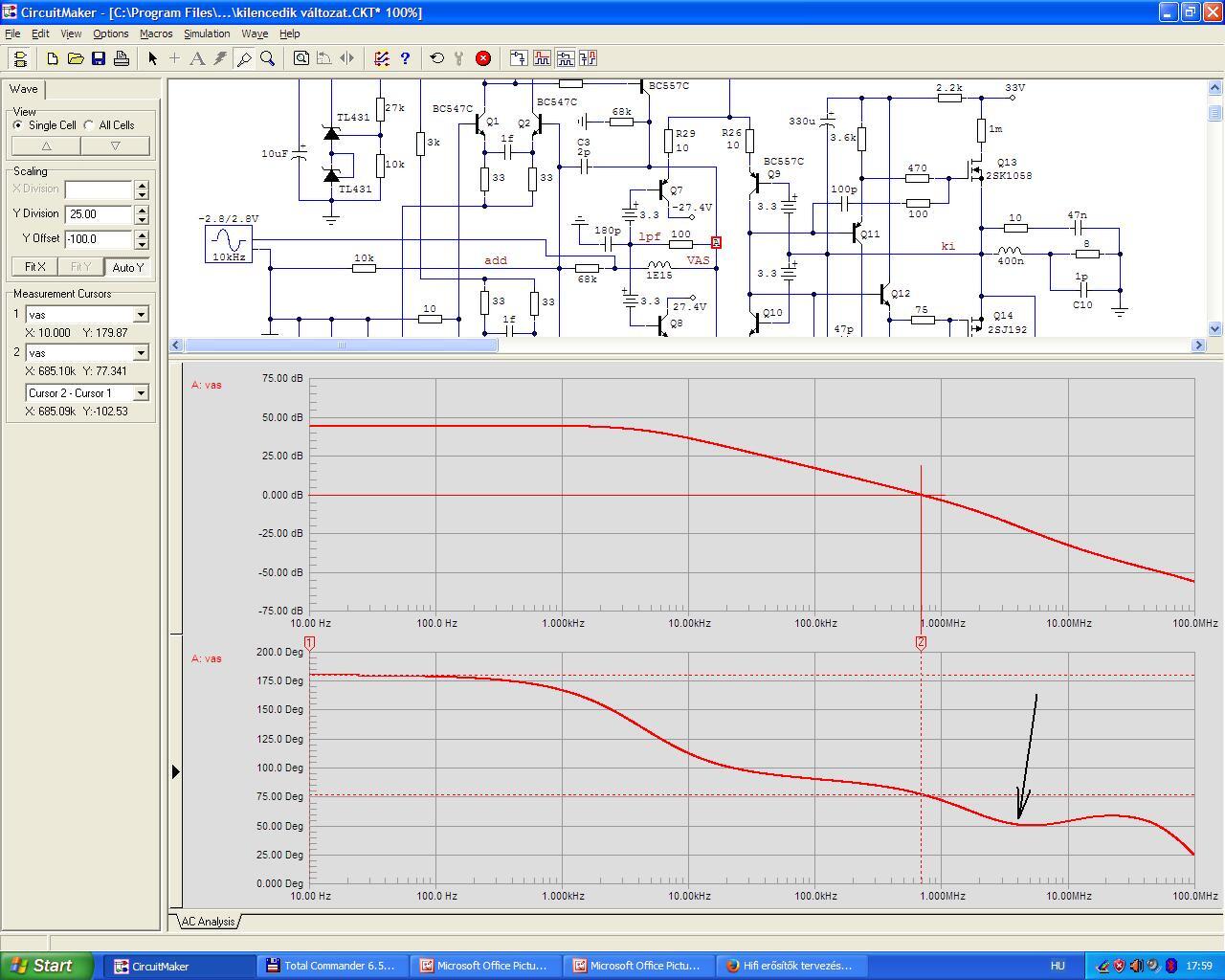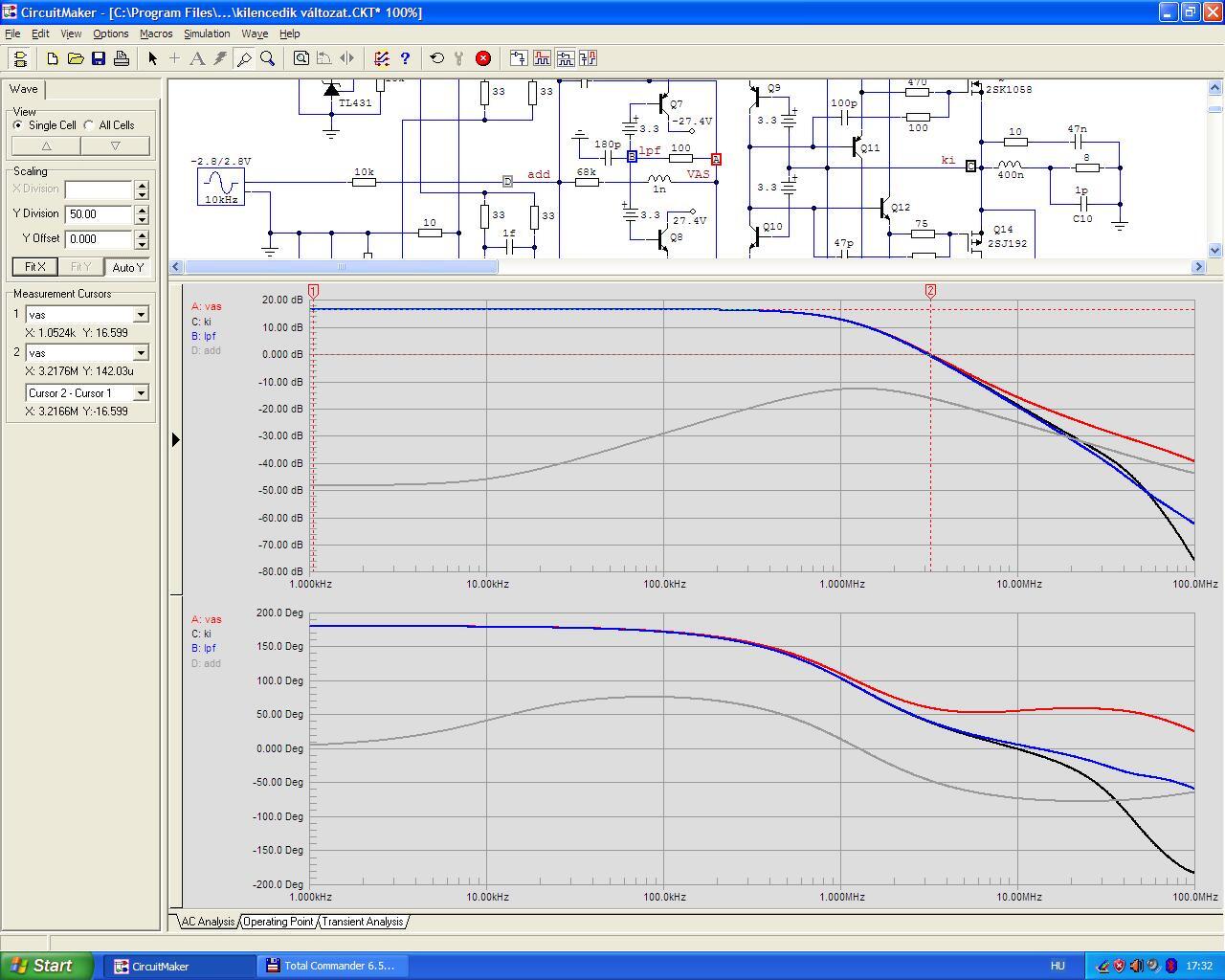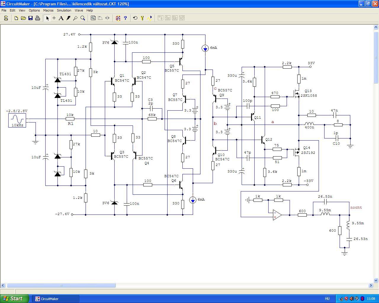 Fél éjszaka nyomkodtam a CM-et, de nem sokra jutottam. Annyira mégis, hogy nem gerjed. 100kHz-en kell szimulálni (illetve ott néztem, de nem "kell"). Tehát... fél siker, hogy nem gerjed. A másik fél siker, hogy Q7,Q8 kollektora mehet a kimenetre. (Így azonos disszipációk lesznek Q9-10-el.) Az aluláteresztő (R32/C17) szerintem kell a VAS kimenetére, hogy ne terhelje be a VAS-t a buffer. A többit még homály fedi előttem. A buffer hurokerősítését próbáltam szimulálni, de nem sikerült, mert VAS kimeneti impedanciáját csak a VAS tudja előállítani - nem lehet tudni mekkora - így hülyeséget mutat. Jó sok idő elment ezzel. Q11/12 kollektor áramán látszik, hogy még egy kicsit magasabb frekvencián el fog fogyni. Ezért nem igazán értem a négyszögjeles mérések lényegét jó nagy kimeneti amplitúdóval. Szinte az összes létező tranzisztor csak az élváltozások ideje alatt van nyitva. Arra jó, hogy látsszon mennyi időn belül élednek fel, meg, hogy kibír-e ekkora túláramot minden fokozat, de mi mást mérünk ilyenkor? Ez csak úgy eszembe jutott most... félálomban.