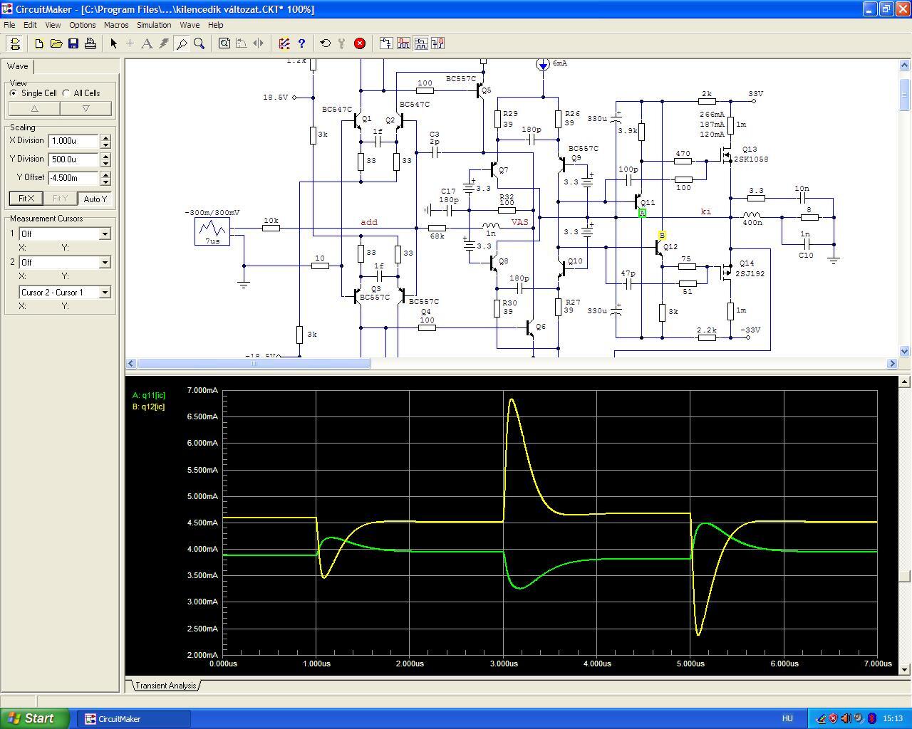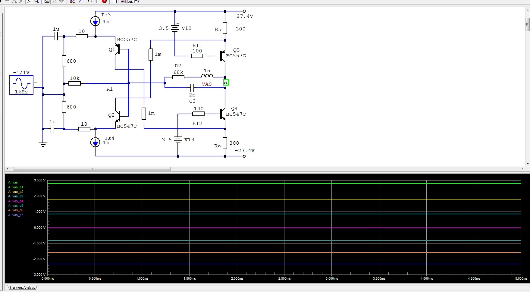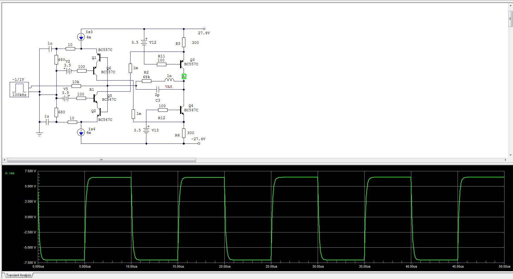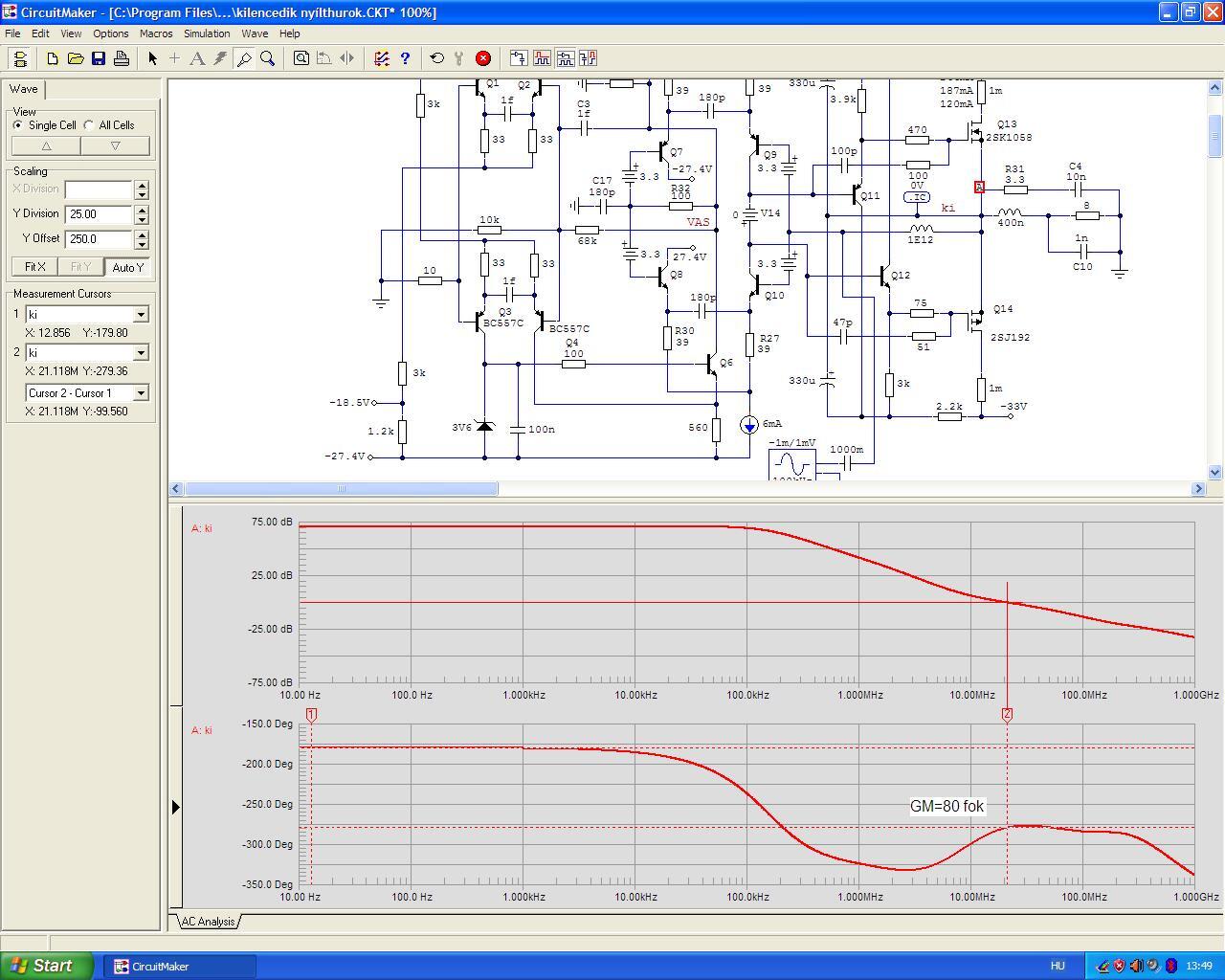 Igazad van ebben Q11,12-ben is. Miért ne lehetne más nyugalmi áramokat beállítani. Most, hogy felriadtam álmomból, azonnal beugrott, hogy rossz irányba rohamoztam idáig a buffer hurokerősítésével kapcsolatban. Tök egyszerű (ha rájön az ember). Így már be lehet lőni a fázistartalékot, de egyelőre nem látom át hogyan. Az is tény, hogy most már nem kell elhinni ha gerjedést mutat 1 kHz-en. Ki kell szűrni, vagy nem kell figyelembe venni. Nem tudja nagyobb "Step Time"-ban pontosan kiszámolni a meredek éleket.