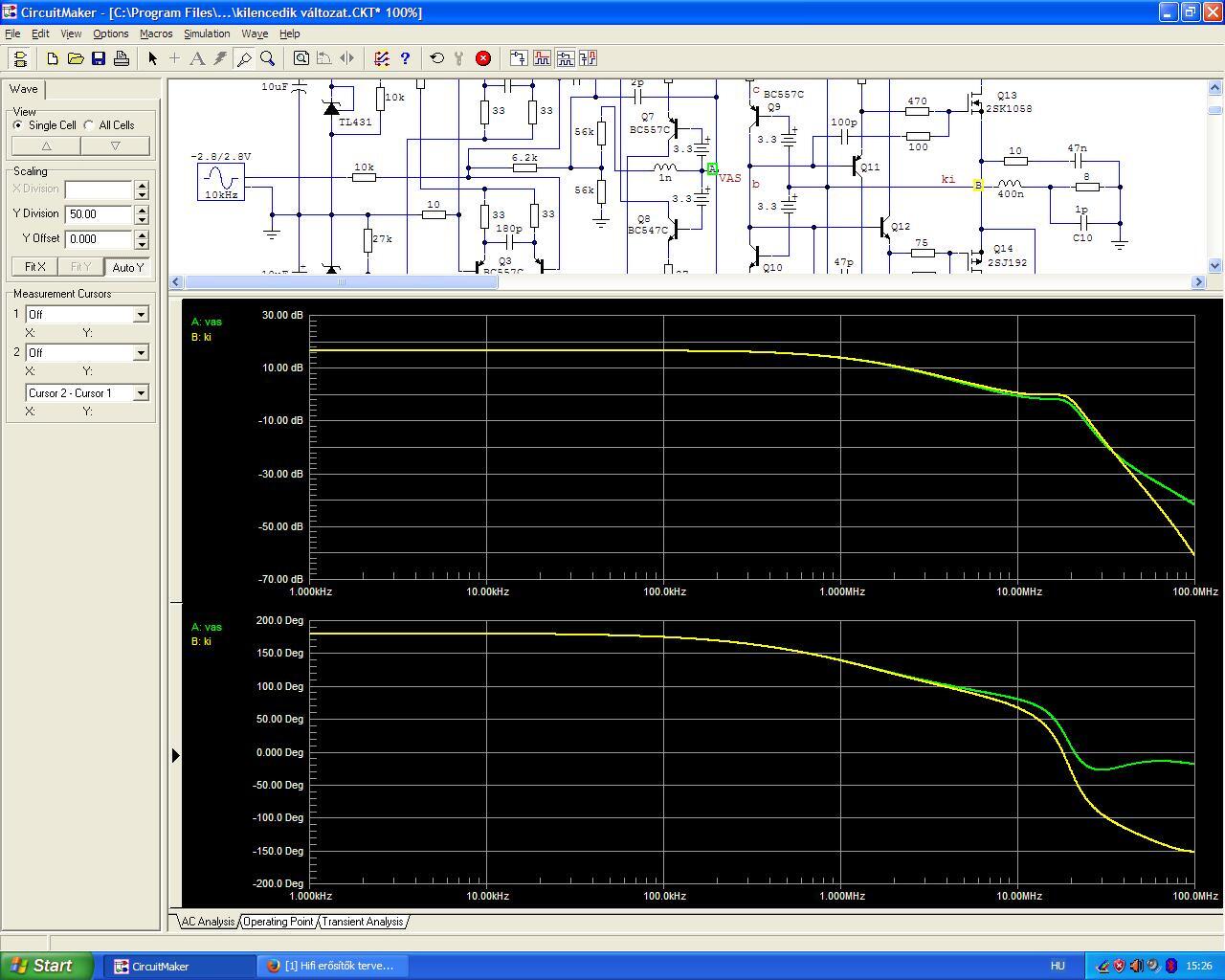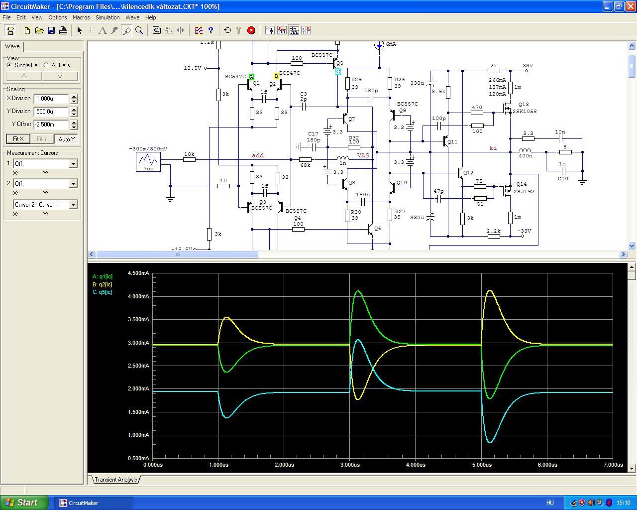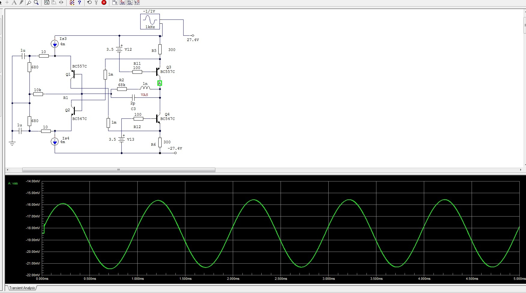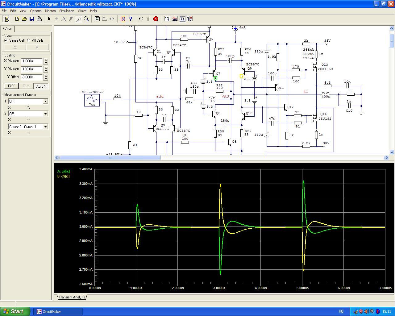 Igazad van ebben Q11,12-ben is. Miért ne lehetne más nyugalmi áramokat beállítani. Most, hogy felriadtam álmomból, azonnal beugrott, hogy rossz irányba rohamoztam idáig a buffer hurokerősítésével kapcsolatban. Tök egyszerű (ha rájön az ember). Így már be lehet lőni a fázistartalékot, de egyelőre nem látom át hogyan. Az is tény, hogy most már nem kell elhinni ha gerjedést mutat 1 kHz-en. Ki kell szűrni, vagy nem kell figyelembe venni. Nem tudja nagyobb "Step Time"-ban pontosan kiszámolni a meredek éleket.