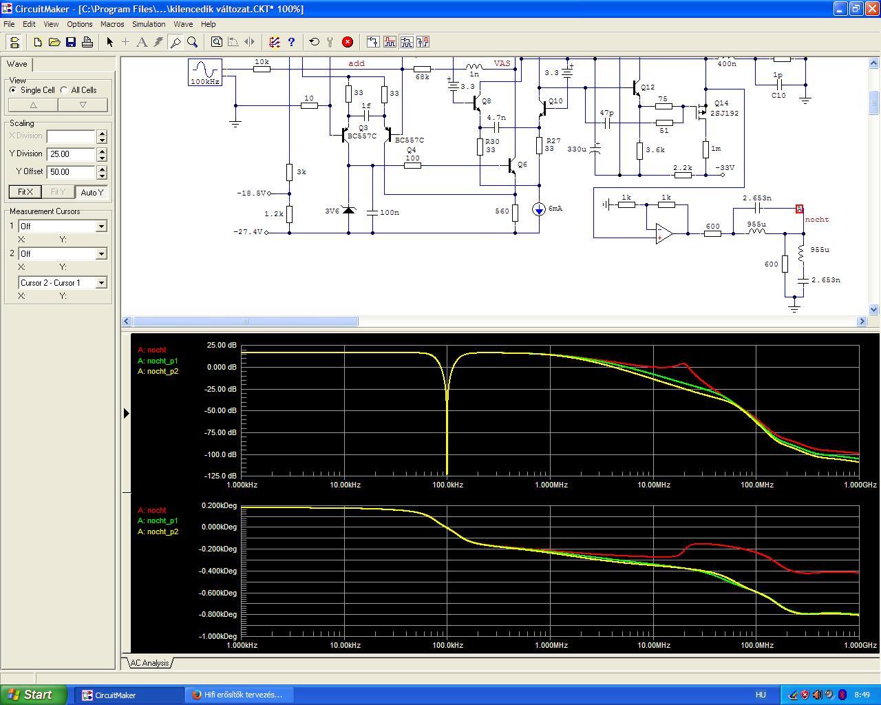 Most meg az a probléma lépett fel, hogy Q7-8 terheli be nagyfrekvencián (10-20 MHz között) a VAS-t. Ami a Nocht szűrő kimenetén látszik, az valóban egy gerjedésszerű akármi. Illetve hát pillanatnyi gerjedés valamelyik fokozatban. Ez ellen tenni kell valamit, aztán jöhet a többi. Nem egyszerű.