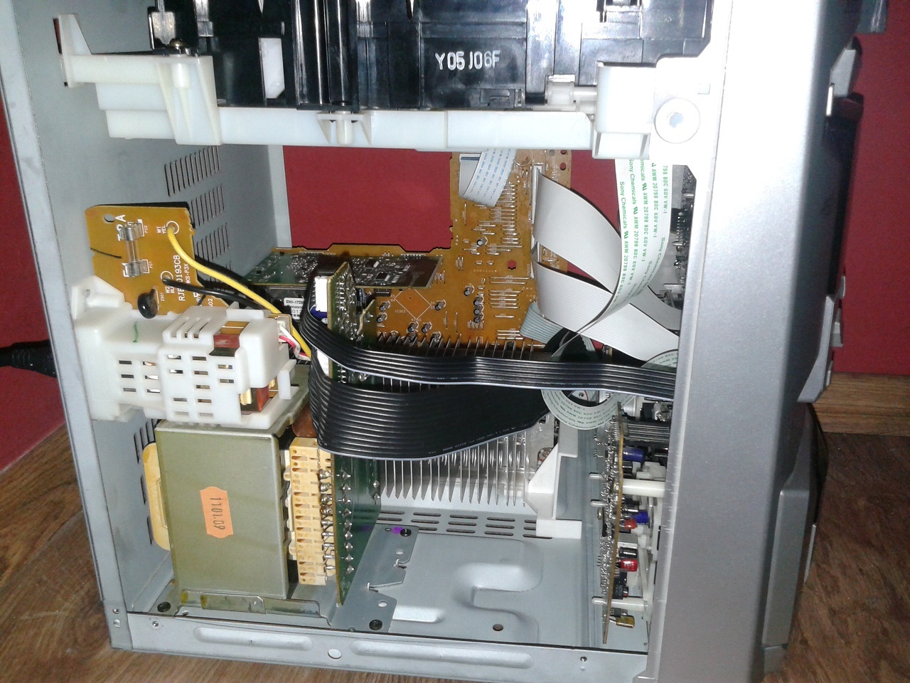 Ha a fekete szalagkábelre gondolsz az gyárilag olyan. Ha jól emlékszem F61 tuner vagy végfok hiba. Meg szerintem az előlappal párhuzamos függőleges panelnél valamit véletlen kirántottál, csak ahhoz, hogy rendesen lásd az egész előlapi panelt ki kell építeni.