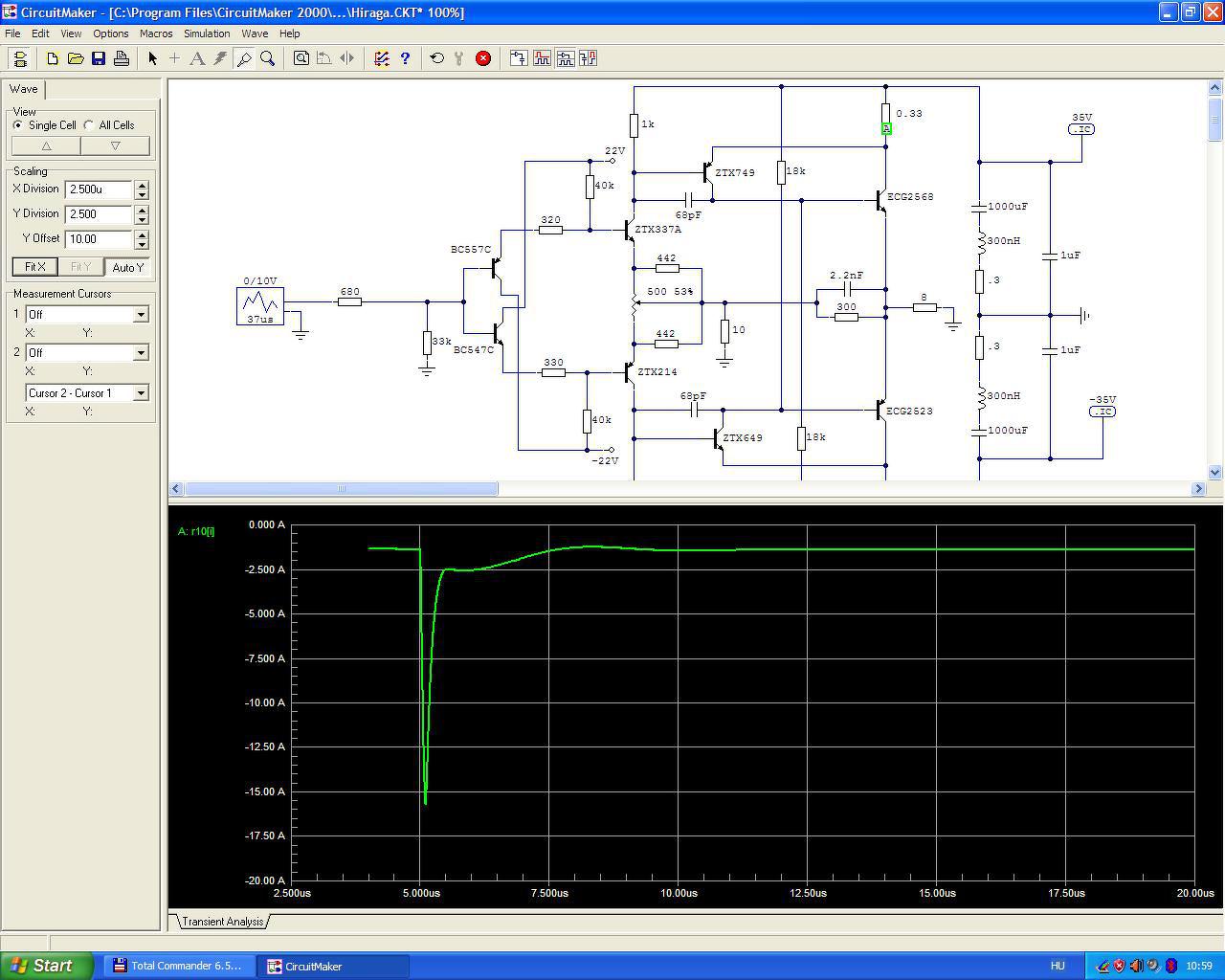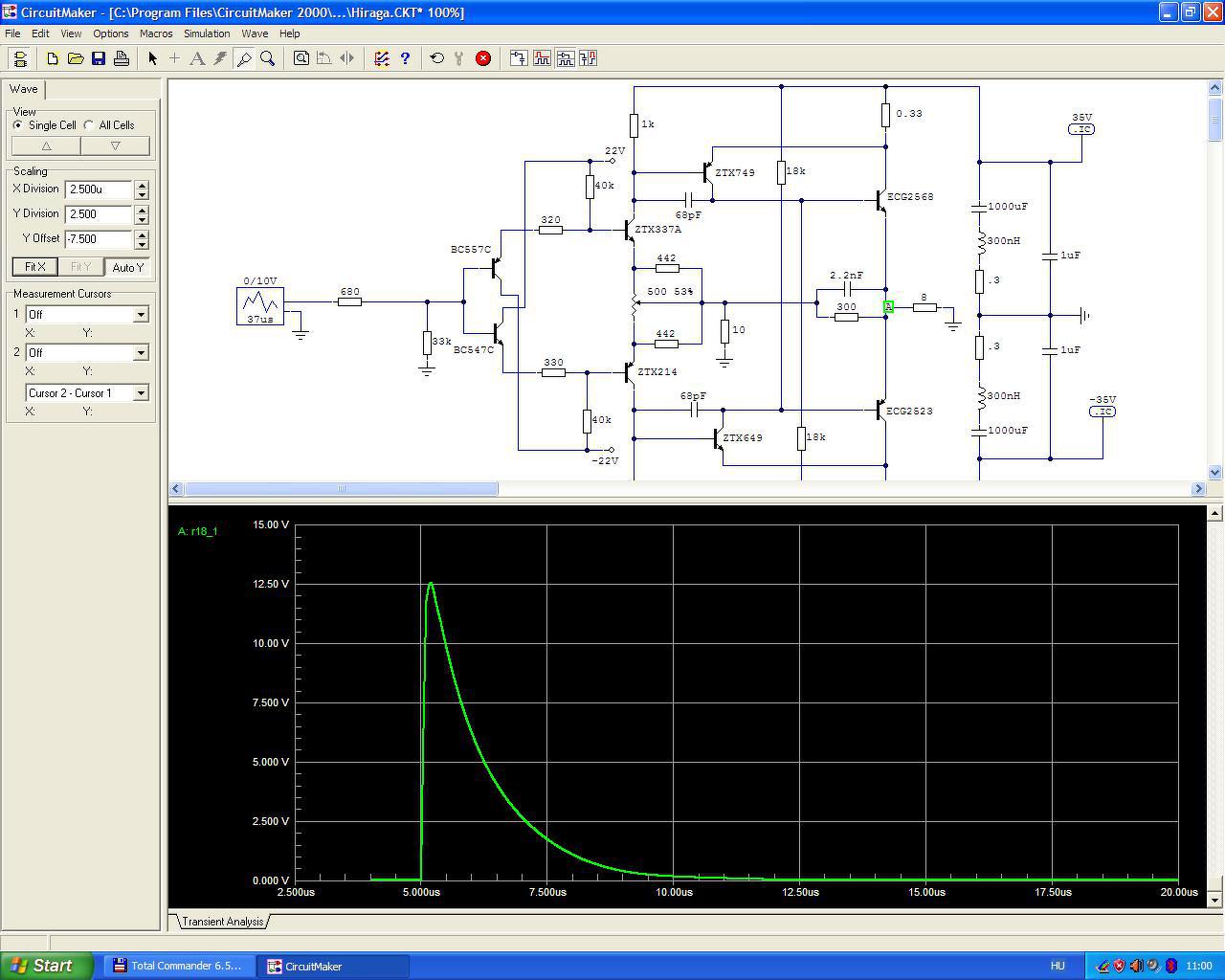 Beadok neki egy 10V-os, 100 ns szélességű tűimpulzust. A puffer belső ellenállása a gyakorlatban is kb. 0.3 Ohm vezeték induktivitásokkal együtt elérheti a 300 nH-t, de ez most lényegtelen. Ha áthidalom a puffereket 1 µF-dal elég drasztikus a különbség a végtranzisztor áramai között. Áthidalás nélkül a kimeneti feszültség 12.09V, áthidalva 12.56V, ez 0.33 dB szintkülönbség. A zene pedig impulzusfolyam, a valóságban ennél durvább dolgok is le tudnak játszódni egy erősítő belsejében. A lényeg, hogy kimérhető az 1 µF hatása, szerintem a gyakorlatban is.