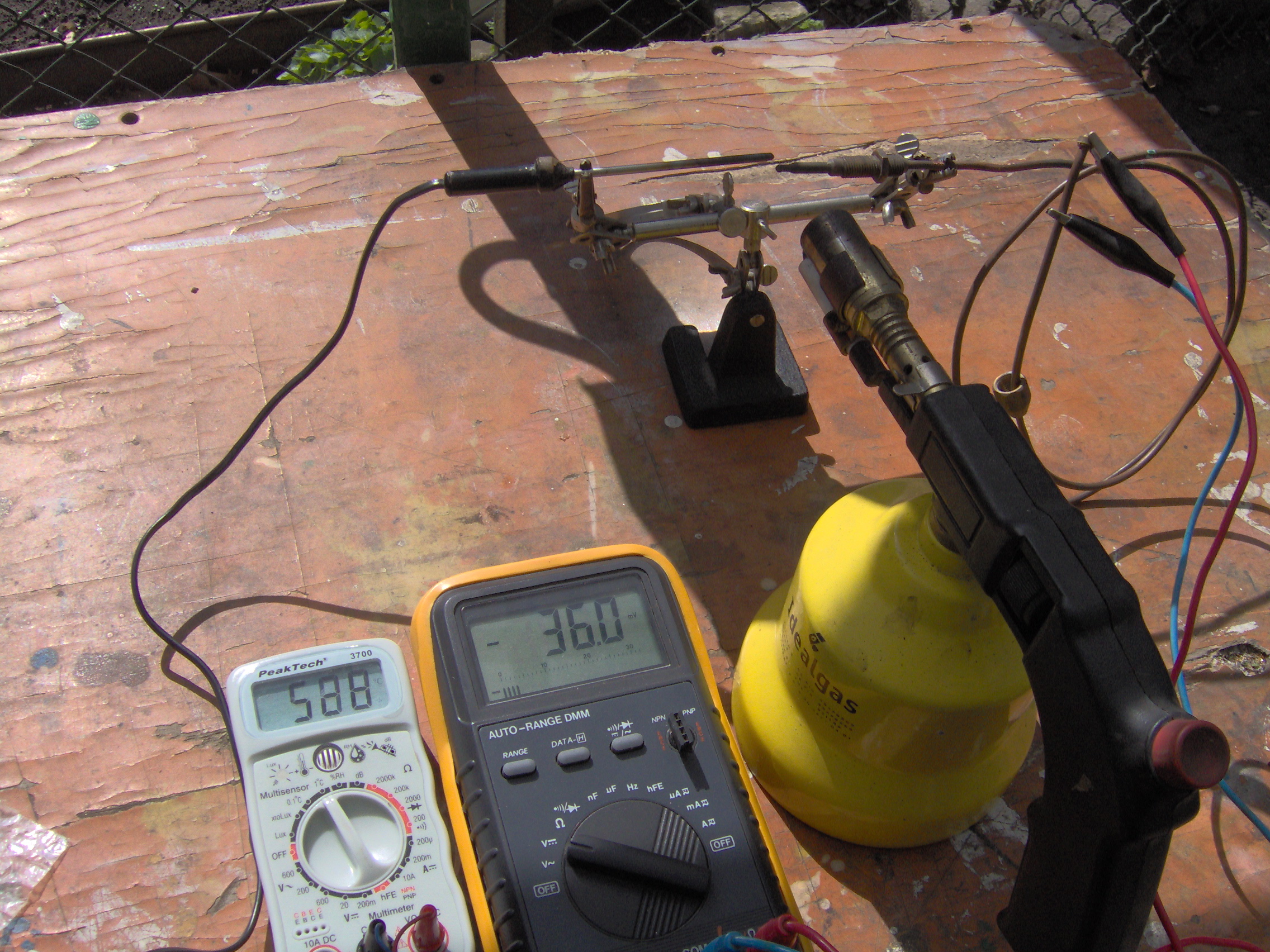 Használható hőelemnek a Cu-Fe, rézhuzal - kerítésdrót (fekete) párosítás ez mindenhol elérhető és nem drága.