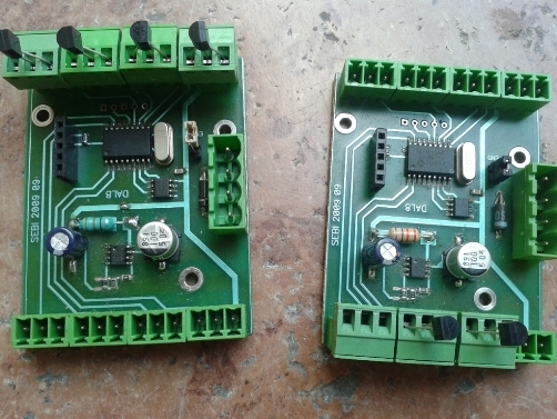 A kép a komplett panelt mutatja,ami egy dobozban lakik. (A 3 pólusú csatlakozók a szenzorok, a 4 pólusú a 485 és táp) A kábelezéshez 4 vezeték kell, amiből kettő feltétlenül sodrott. Jó esetben a meglévő Ethernet hálózat az UTP kábelben lévő 4 érpárból csak kettőt használ, ezek az RJ45 1-2 és 3-6 pólusait használják. A maradék két érpáron megélnek a dobozkák távtáplálással: egyik érpár a táp, másik az RS485. Az összes 4 pólusú csatlakozó párhuzamosan van ezen a vonalon, végén a PC USB-be dugható illesztő egységgel és a táppal. Eddigi legnagyobb távolság kb 400méter volt, ahol kifogástalanul üzemel - ipari környezetben. Elméleti határnak 2 km-t mond a szakirodalom.