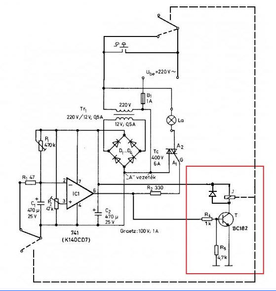 Jó rég foglalkoztam a problémával, 555 helyett építettem egy uA741-ből komparátoros, triakos megoldással időzítőt, HobbiElektronika egyik régi száma alapján. Működik is, tartja a kb 5 percet, amit beállítottam, viszont ismét szükség van a tranzisztoros relés kapcsolásra, mert így állandóan áram alatt van az áramkör és a célja az energiatakarékos világítás lenne. Szóval a 741 meghajtaná a triakot, amivel az égőket kapcsolom, meg a tranyót, amivel a relét kapcsolom. Az indító kapcsolóval lényegében majd a 230V-ot fogom adni az áramkörnek és a relé fogja ezt megtartani, addig, míg a komparátor ki nem kapcsolja azt. A tranzisztoros részét megcsináltam próbanyákon, nagyon alapban: Bázison föld felé 4,7k, 12V felé 1k, elötte még egy kapcsoló, amivel a 12V-ot adom neki. Emitter földön. Collektoron a relé. Ez így jelenleg működik is, viszont az BE feszültség így is 0,85V és vadi új a tranyó (BC182), bekötéshez az adatlapját néztem meg, így helyesnek kell lennie. Ez így akkor most jó vagy nem jó? A kész elektronikát még nem szedtem le a falról, hogy kiegészítsem és amíg nincs biztos megoldás, addig nem is akarom.