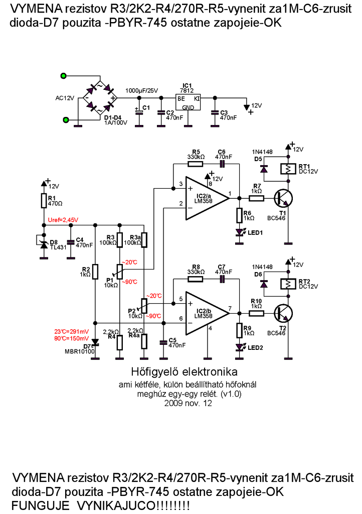 toto daj do transalatra inač neviem tito napisat ale teraz dobe počuvaj vymen R 3 2K2-R4-270R -R5-1M-CONDENZATOR-C6 vynechaj 1M sojis s ic 1a 3 nozikamy toto zapojenie jak pisem funguje na 100 precent a trimer 10k je dore citlivy tak že velmy dore sa steluje teplota. este raz takto vymenit otpory za tie co som napial fungue velmy dobre este aj teraz ho mam na stole inač mozes použit v orginal cheme LT 1078CN ale musis vymenit R-3 za 100k a bude fungovat tiez dore ale vtedy LM 358 nefungue dore ale po tych upravah čo som napisal chodi to na 100 percet dobre