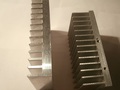 Két szempont szerint készültek. Az első, a Canamp megmaradt darabjait hasznosítottam, mivel utánam a szemétbe végeznék. Ezek régi darabok voltak, rendesen csáréra vágva. A másik az alájuk szerelt hőpuffer elemek, amiket frissen vásároltam, és otthon derült ki, hogy kalapálták is őket. Maradt a gépi megmunkálás (nem ingyen). Mindkét esetben spórolós megoldással, mivel sokat nem akartam az anyagokból elfaragtatni. Ami nem lesz szem előtt, azt nem egészen húzattam tisztára. Továbbá, a bordákat meghagytam teljes hosszban, ezért lógnak ki majd hátul. Ennek oka a bizonytalanság. Ha elegendő lesz így ahogy van, vagy még enged kisebbítést is, akkor a puffer méreteire fűrészelem. Ha meg így is kevés, akkor bordacserére lesz szükség. Az eddigiek alapján bejött a repülőgép szárnykiképzés az EVAmp-TB-ME-nél, tehát itt is alkalmazom. Természetesen a paneltől elszigetelés is jelen lesz. Mivel a borda rögzítését a lábaival oldottam meg. A földelést a középső csavaron át fogja kapni. Kezdő építőknek: felülről a borda alá teflonlap kerül, alulról pedig a képen látható lépcsős teflon szigetelőgyűrűk biztosítják az elszigetelést.