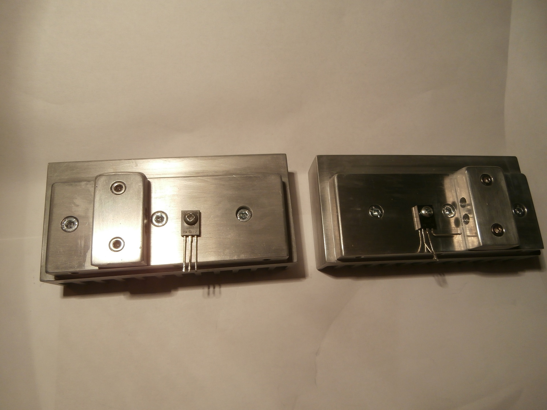 Ami irányadó volt, hogy elegendő e egy kisebb magasságú borda megfelelő hűtést biztosítani a majdani készülékemnek. A továbbiakban az egyszerűség miatt a régebbit a külseje miatt korcsnak, az újat, ami méretre mart, belaminak nevezném. A korcs méretei, 111x60x33 mm. A 33-ból 7,65 a hátsófal vastagsága, és 25,4 a lamellák mélysége. A lamellák vastagsága a hátsófalnál 1,8 mm. És a lamellákból 14 darab van. Ebből számolva 1,8x60x14= 1512, azaz 1512 négyzetmilliméteres felületen vonják el a hőt a hátfalról. De mi a helyzet a belamivaj? A belami méretei, 111x56x25 mm. A 25-ből 10 a hátfal vastagsága, és 14,8 a lamellák mélysége. A lamellák vastagsága a hátsófalnál 3 mm. És ezekből 13 darab van. Ebből számolva 3x56x13= 2184, azaz 2184 négyzetmilliméteres felületen szívja el a hőt a hátfalról. Ez persze nem egészen pontos mérési adatokból áll össze, de azért jól érzékelteti az eltérést a két felület nagysága között. Nem vagyok mérnök, csak hobbista, de én úgy gondolom, hogy a hőáramlást a hővezető képességen kívül az adott felület nagysága határozza meg. Hőtorlódás esetén magasabb üzemi hőmérséklet adódik. És hőtorlódás akkor keletkezik, ha a hűtendő eszköztől a lamellákig valahol nem elégséges a keresztmetszete a hűtőkomplexumnak, azaz a borda geometriájának. Esetemben, összegezve, a belaminak jobb a hőelvezető képessége a lamellák felé. A gyakorlat majd úgy is felel rá, hogy mi a valóság az elképzelésemet illetően. És még egy, a belami csak belami, mivel gyártási hibája van. Görbe a szépfiú. Talán azért is ilyen jó megjelenésű. A hátlap felhúzása nélkül (marógép) nem lehet nagyobb felületet ráfogni hőelvezetés céljából. Az EVAmp-ME esetében magát a bordát az élén rögzítettem, és csak kisebb felületek kerültek rá, amiknek a hőelvezetője volt. Így nem észleltem a görbeségét. Azonban most más a helyzet...
