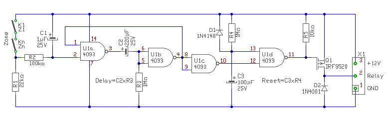 van 5 db nyitásérzékelő /sorba vannak kötve--alaphelyzetben zártak/1 db 12v relé is van az áramkörben -ő is sorba van kötve ----ha bármelyik nyitásérzékelő megszakítja az áramkört a relé sem kap áramot és elenged,ekkor zár egy másik áramkört és megszólal a sziréna.ha gyorsa visszanyomják az ajtót akkor megint záródik a nyitásérzékelős áramkör és a sziréna elhallgat,mert a relé ujra bezárja a kört. most az kellene,hogy akármilyen gyorsan is újra zárul az /nyitásérzékelős/ áramkör a másik áramkör is kb.1 percre zárva maradna ---két külön áramkör melyet 1 db relé nyit vagy zár