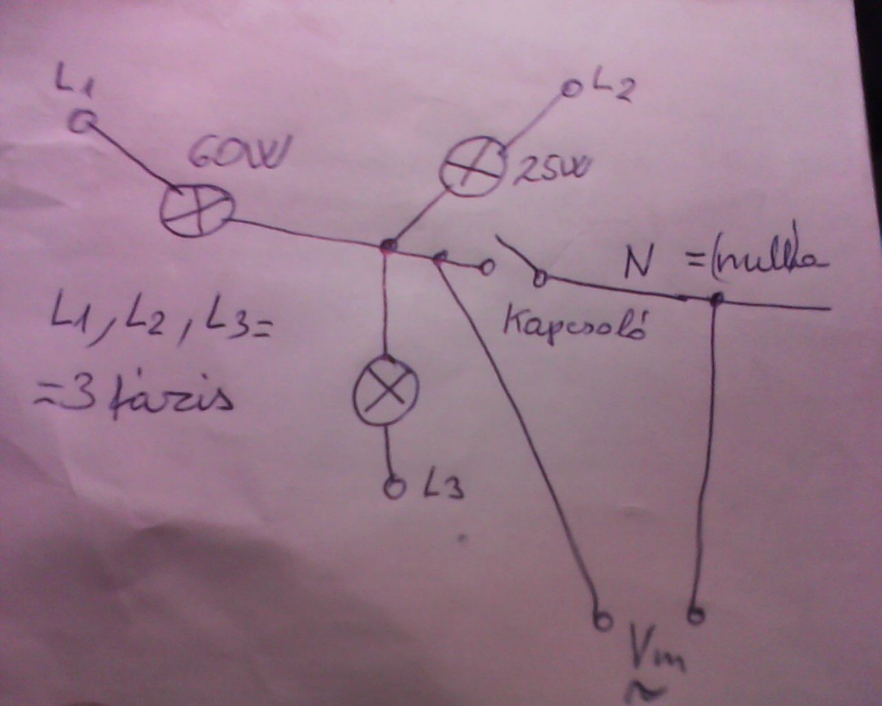 Küldök egy skiccet ,mint említettem 3 fázis van volt munkatársamnál .A három izzó legyen más teljesítményű és kapcsold rá a 3 fázist a rajz szerint Vigyázz 400V látni fogod az összes izzó teljes fénnyel világít ,na most csoda kapcsold ki a kapcsolót és rádöbbensz miből állapítottam meg ,hogy nincs nulla ,ja a műszert előtte kapcsold be mert lehet ,hogy a 25/legkisebb W izzó örök vadászmező . Az izzó még is megúszná akkor mérsz akár 30-40V-ot .Ha jobban figyelted volna a kerti csap és a tőle 20méterre levő földbe ledugott csavarhúzó közt lépésfeszültséget mértem 20-30V~ .A TSZ-nél három ilyen esetem volt Pl egyik istálóban a fénycsövek heten égtek ki , megúntam nagy szerviz null hiba a főkapcsolónál.A rajzom szerint a műszer jobb alsó résznél van L3 nincs W találj ki mást mint én írtam 3.érték(W),Légy kreatív. A háznál alkalmazott mérési elvet holnap az az ma beszkennelem ha érdekel .Most is kicsit hosszú az írásom.Remélem a rajz érthető és egyszerű. Üdv