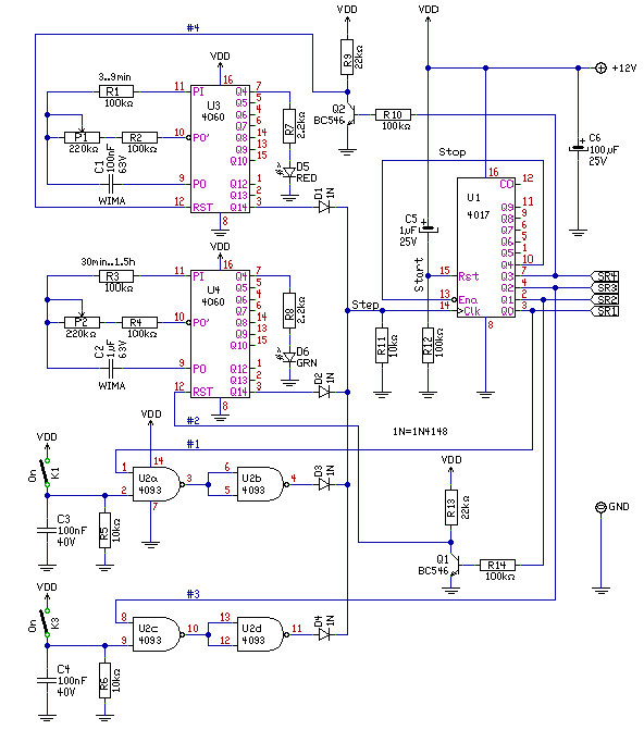 - A kapcsolásban szereplő dióda arra szolgál, hogy amikor a számláló elérte azt a kimenetét, ami a relét bekapcsolja, akkor leállítja az oszcillátort. Ez azzal jár, hogy a számláló, ebben az állapotában marad (a számlálás az oszcillátor léptetésének hiányában megáll) mindaddig, míg a RESET gombot meg nem nyomja valaki.