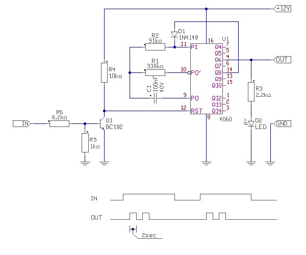 Köszi, most már érthető. - Tekintettel arra, hogy a CD4060 egy bináris számláló, így minden Qx idő az előttelévő Qx-1 időnek kétszerese. - Jelenlegi kimeneten, ez 2sec-re van beállítva, tehát nem kell mást tenned, mint at "OUT" kimenetet áthelyezni a Q6-ról, a Q4-re, és a dióda anódját, a Q8-ról a Q6-ra és már is 0,5sec lesz az impulzusidő. - Természetesen megváltoztatható az ütemidő is, az R1és C1 megváltoztatásával. - Ütemidő kb. R1*C1*2^Qx (Q4 out esetén: 330*10^3 * 100*10^-9 * 2^4 =0,528sec) - Ha megfigyeled, akkor az első impulzus megjelenése, egy ütemmel később kezdődik, mit az "In" bemeneti jel megjelenése. Tehát az első impulzus, csak 0,5sec idő mulva fog megjelenni, és nem azonnal. Erre azért hívom fel a figyelmedet, hogy nehogy problémát okozzon. - Ahhoz, hogy mind a két impulzus kijöjjön, az In bemnetnek, legalább 2sec ideig magas szinten (+12V) kell lenni. (0..5sec szünet + 0,5sec jel + 0,5sec szünet + 0,5sec jel) Ha a bemnet ennél rövidebb ideig van magas szinten, akkor az impulzusok ott megszakadnak, ahol éppen tart az idő. - Ez az áramkör, csak a két impulzust adja le, hiába van a bemneti jel magas szinten bármely ideig. Másik két impulzusra csak akkor számíthatunk, ha a bemneti jel, legalább egy pillanatra nullára esik. Egyszerűbben szólva, a bemneti jel felfutó éle indítja el a működési folyamatot és nem ismétlődik. - Ha a bemneti jel visszatér nullára, azonnal "reszetelődik" az áramkör, és a kimenet alacsony szintű lesz. Na, jól körbe ragoztuk ezt a kis nokedli rajzot. üdv! proli007