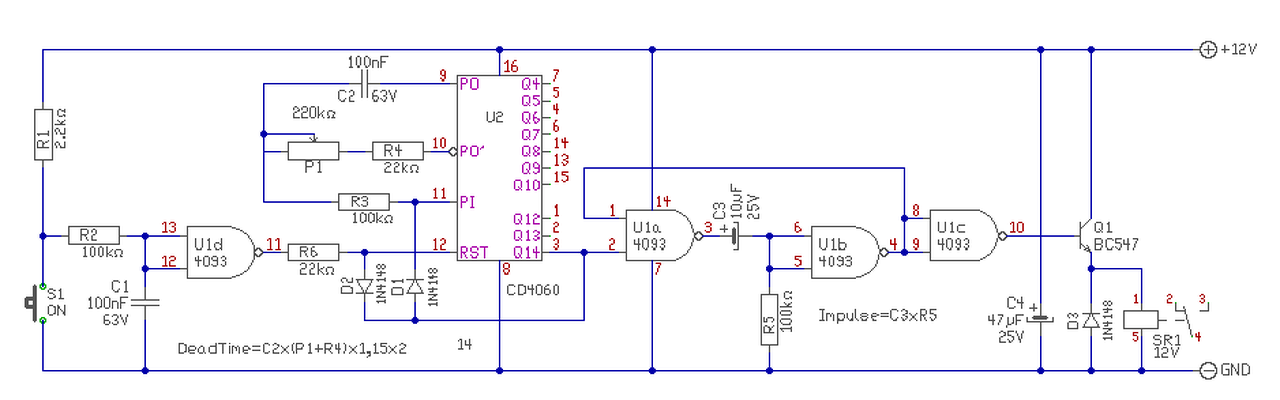 Hello! Valami ilyesmire gondolsz? Relét ugyan nem biggyesztettem a kimenetére, de ha gond odarajzolom. A működésről még annyit, hogy táp bekapcsolásakor is fog egy impulzust adni, valamint ahányszor megnyomod a gombot a holtidőn belül, mindig újra kezdődik a holtidő.