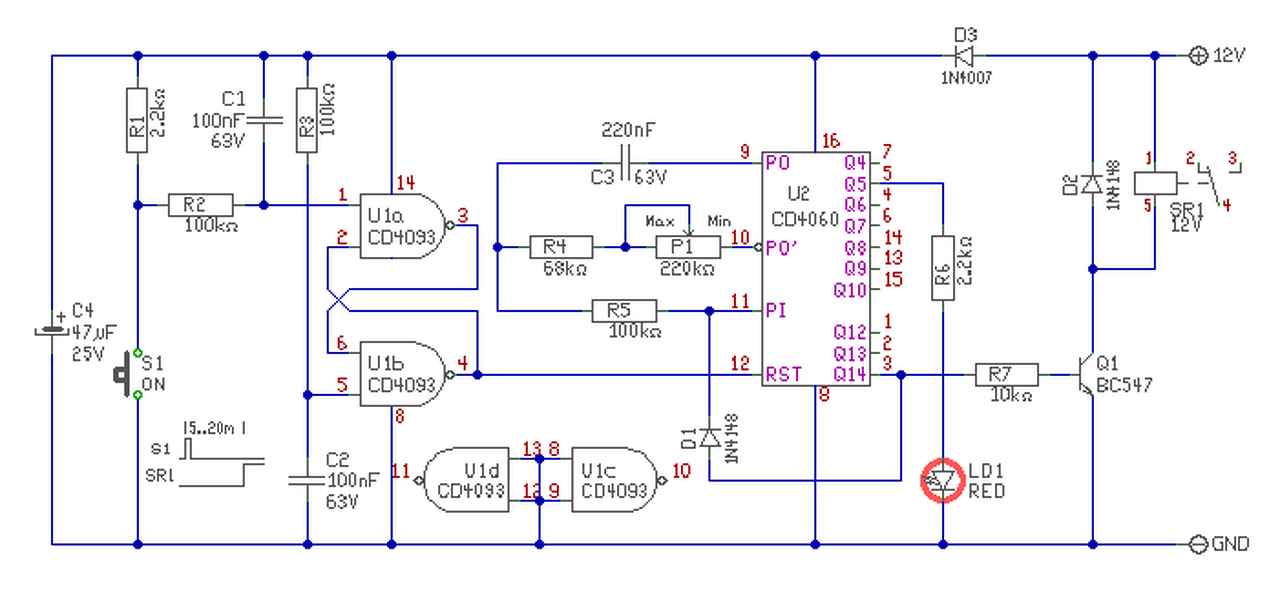 Egy olyan kérésem lenne hogy tud e valamelyikőtök egy egyszerű kapcsolást arra hogy, olyan időzítő kelen ami 12v-os és ha adok neki egy impulzust pl egy nyomógomb megnyomása után bizonyos idő után pl 5 perc után vált át egy relé ....