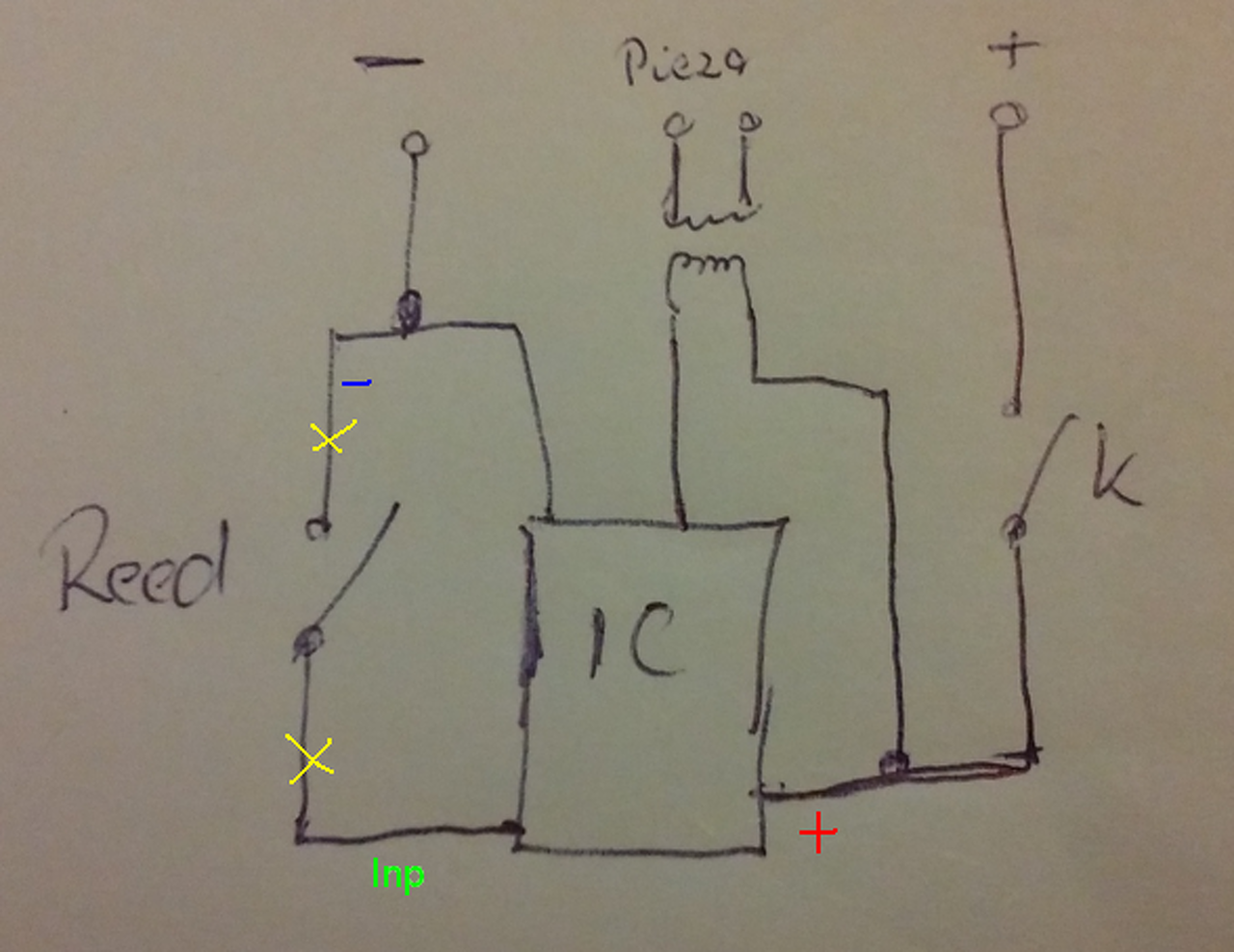 Nem értem teljesen a rajzodat. Itt van előttem szétszedve egy ilyen riasztó, lerajzoltam kézzel a kapcsolást. A piezo előtt ami van nem tudom pontosan mi, gondolom egy kicsi trafó lehet. Átrajzolnád, hogy hogyan gondolod a módosítást?