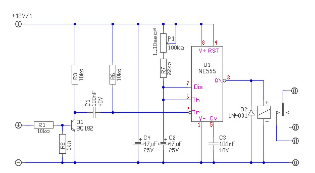 Mint a diagram is szemlélteti, a tápfeszültség ráadása után, a relé a potméterrel szabályozható 0-10 másodperces késleltetési idő múlva kapcsol be, egészen addig az állapotig amíg a tápszültség fennáll.