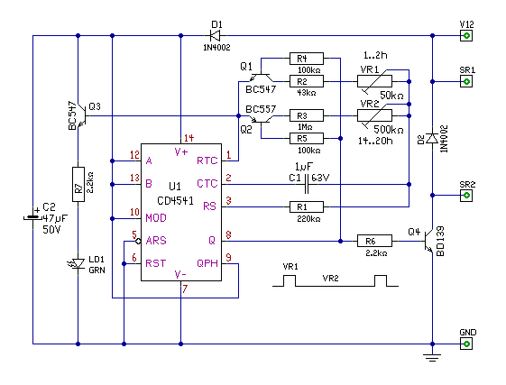 Jelenleg másfél perc az időzítés, de a 47nF cseréjéve tetszőlegesen módosíthatod.