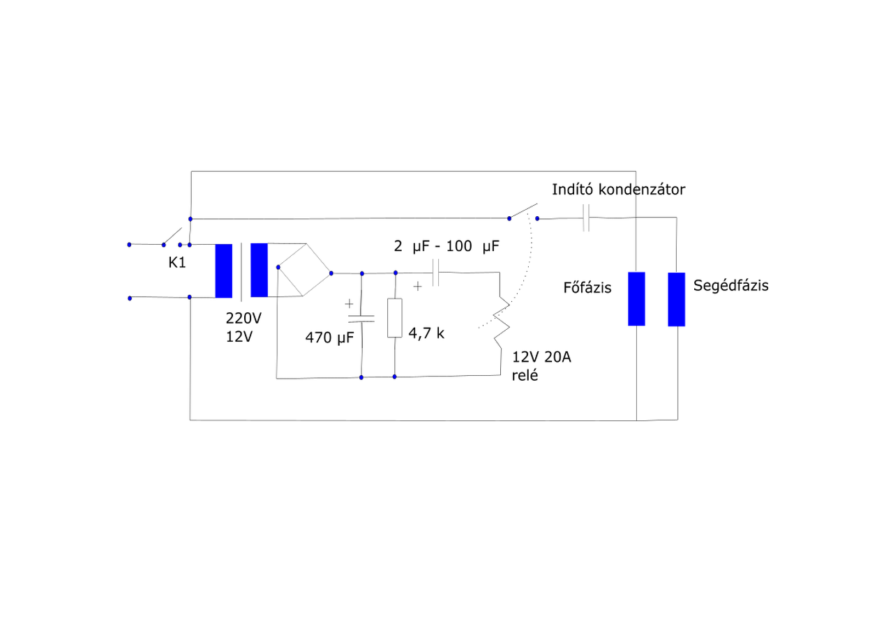 Először is köszönöm, hogy segíteni próbálsz.Teljesen igazad van. Az én motorom is indító kondis. Az indító kondim értéke 120uF. A nyomógombos indítást ismerem, de nem akarom használni, mert ez a motor após szalagfűrészén teljesít szolgálatot, és ő az a fajta ember, aki biztos tovább nyomja, vagy nem elég ideig, ilyesmi. Neki olyan megoldás kell, ami automata. Az időkésleltetés lehet(ne) megoldás, de ezzel nekem az a bajom, ha mondjuk a fűrész befullad, az újra indítás a segéd fázis nélkül lehetetlen. Tehát valami olyasmi lenne a tökéletes, ami méri a főtekercs áramát, ha megáll a motor húz egy relé, ami rákapcsolja a segédtekercset, ha felpörgött, lekapcsol. Ezt a funkciót látja el a Miha relé. A linkelt rajzon, azt mondják az "okosak", hogy 2 kondi van a segédtekercsen, egy üzemi (állandó), és egy indító (a kettő összege lenne a 120uF). Az üzemi csak rásegítene a segédtekercsre(állítólag így nagyobb a motor nyomatéka). Az indító kondi be-kikapcsolását pedig a feszültség figyelő relé csinálná valahogy, a segéd tekercs feszültségéből. Csak fogalmam sincs, működhet ez így? Persze nem az üzemi kondi a lényeg, az ki is hagyható éppen.