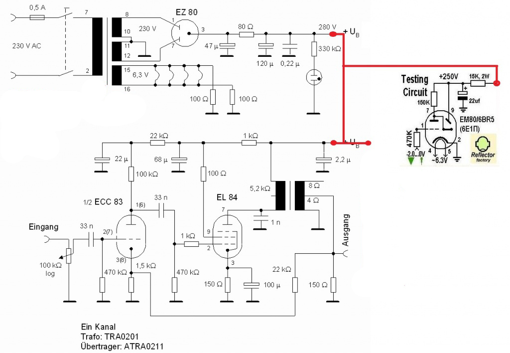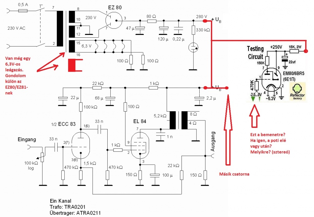 ja amúgy megtaláltam azt a kapcsolást neten ami összegzi a sztereó végfok két jelét és egy em80as csövön mutatja, csak itt kettős trióda ecc81-es én ecc85-tel akarom megoldani. tudja valaki hogy akkor itt kell valamilyen változtatás az áramkörben vagy minden marad a régiben?