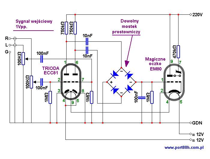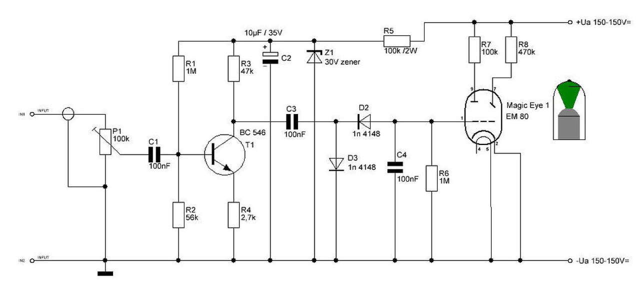 Valami ilyesmi, ECC81 helyett lehet 82-83, tápfesz lehet akár 250V is, greatz sem muszály. Az EM84 bekötése kicsit más, de bárhonnan lelesheted. Ez a kapcsolás erősít akkorát, hogy a bemenetre akaszthassd.