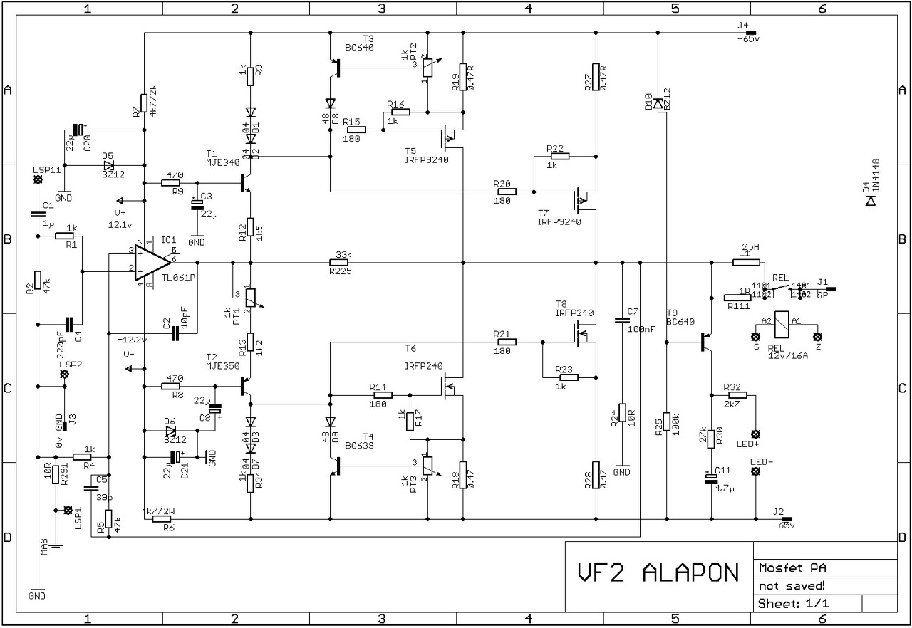 Nem építettem ilyet, de bízom benne. A kapcsolásra felírtam néhány dolgot, amik közül kiemelném a szokatlan "beforrasztva" utasítást. Tapasztalatom szerint, az elérhető panelbe forrasztható biztosítékok nem képesek kellő erővel szorítani az üvegbiztosíték kupakját, ezért azok kimelegszenek. E miatt a biztosítékot "részben" be kell forrasztani a foglalatba. A "részben" azt jelenti, hogy csak felül, csak az egyik szorítófülhöz, és csak egy sávban forrasszuk meg. Így stabil lesz az átvezetés, de ha szükséges (igaz pákával), de lehet biztosítékot cserélni. A kész erősítőhöz elengedhetetlenek a kiegészítő áramkörök (pl. clip, DC védelem, lágyindító, ventilátor vezérlés).