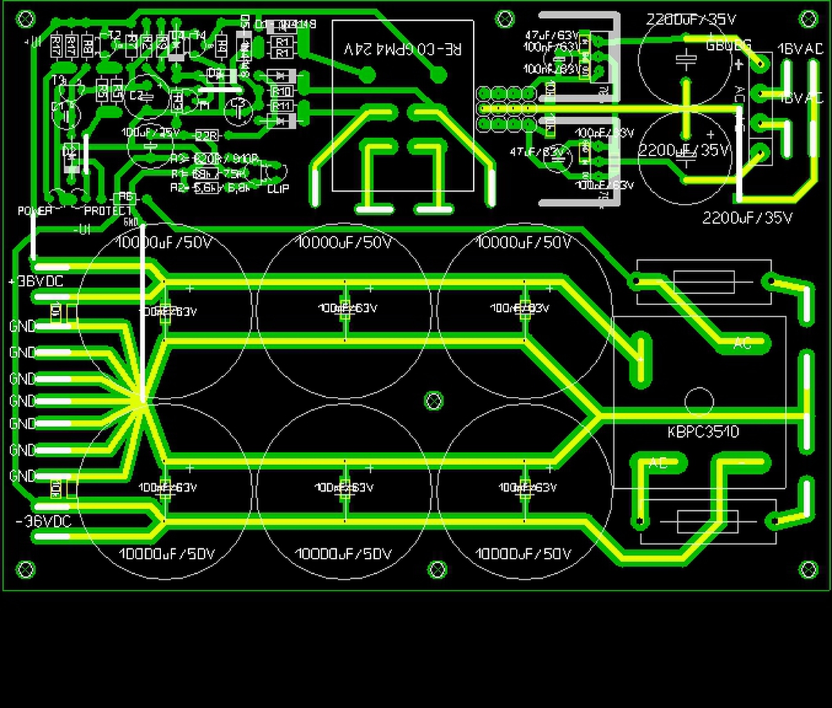 Kényszer megoldásnak át alakítottam a GF400-at. Nincs hely csak négy IRFP-nek de rajta kell hogy legyen a clip + a hangszóró védelem reléje is. Na valahogy össze hoztam egy rajzot biztos hogy vannak hibák ( még akkor is ha nem akartam ) . Megkérném a szakikat hogy nézzék át hogy folytathassam a lap tervezését. Meg kérném hogy ezt a rajzot tötröljétek mert én is sok hibát találtam benne - Át dolgozom és újra felrakom. Bocsánat