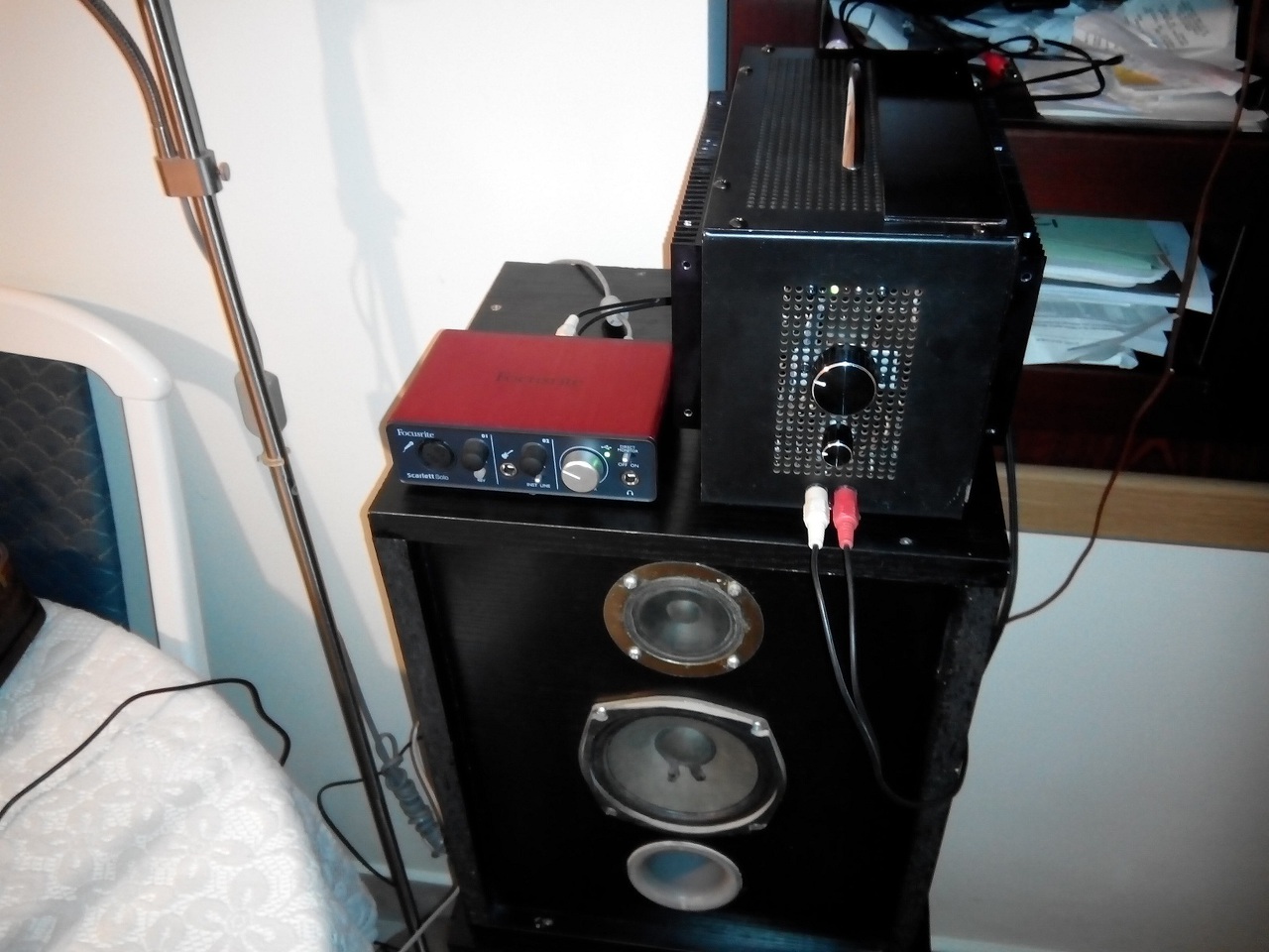 Elsőre indult, semmilyen huncutságot nem tapasztaltam. A fotón lévő bordával, clip közeli kivezérlésnél, még éppen tapintható a borda, de határozottan meleg. A tápfeszültség (clip-ig vezérleve) kb. +-26,6V (zenével mérve). A használt frontsugárzók névleges impedanciája 4R, a SUB pedig 8R (2 sorba kötött 4R-os).