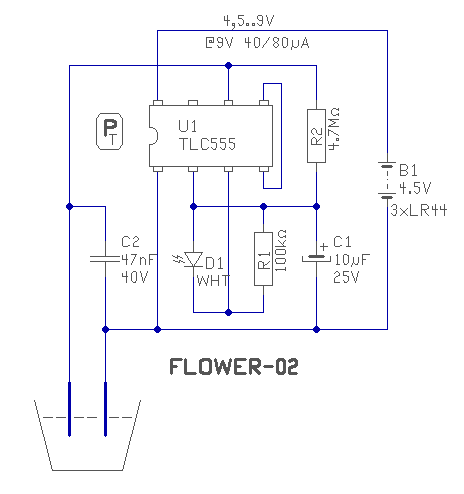 Akkor egy "változat", amit nem kell programozni.. Az 555-nek kötelező CMOS-nak lenni, a sima nem jó! A Led fehér, kisáramú (jó fényerejű) legyen. üdv! proli007