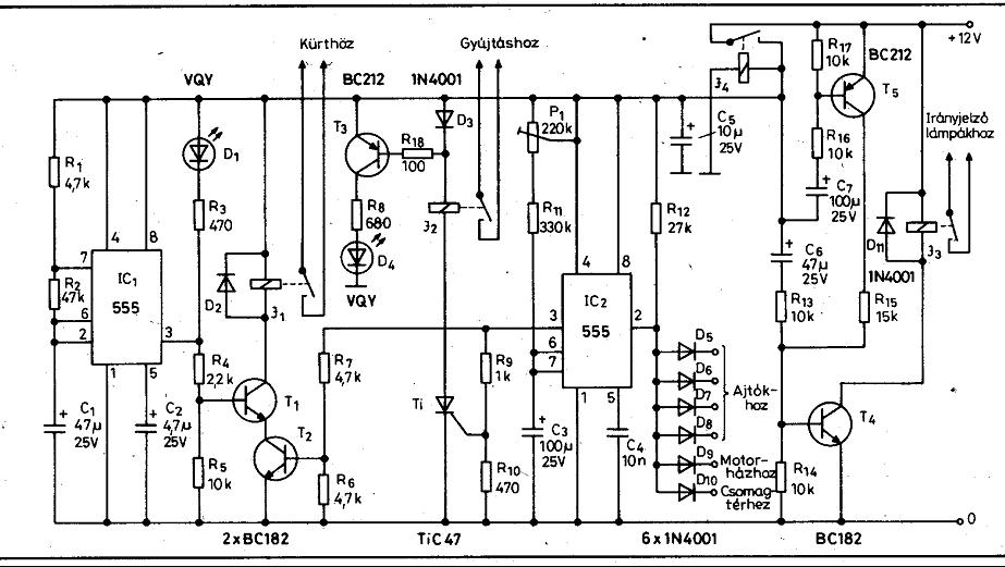 A 2. képen lévő kapcsolást szeretném megépíteni a Skodánkba. Nem szeretnék REED relét alkalmazni. Úgy szeretném működtetni, hogy mikor elhagyom az autót, akkor egy nyomógombbal(SW1) bekapcsolom az áramkört, az autó ajtó kinyitása után pedig legyen pl. 10-15 másodpercem, hogy két nyomógombot(SW2-SW3) egyidejűleg megnyomjak, ezzel kapcsolnám ki. A 1. képen lévő kapcsolással szeretném kiváltani a REED relét, már ha működne vele . Tudnátok mondani ellenállás értékeket? TIC106 jó lenne e célra? Folyna rajta keresztül akkora áram bekapcsolt állapotban, hogy ne zárjon le a tirisztor?Még az lenne a problémám, hogy lehetne megcsinálni, hogy ne induljon el a riasztás addig a 10-15 másodpercig, amikor kinyitom az ajtót, és miután aktiválom a kapcsolást és becsukom az ajtót?(mert ugye az eredeti kapcsolásban szerintem a REED relé az ajtóban volt elhelyezve, és így az ajtó kinyitása nélkül lehetett ki ill. bekapcsolni az áramkört) Üdv.