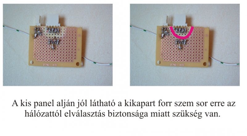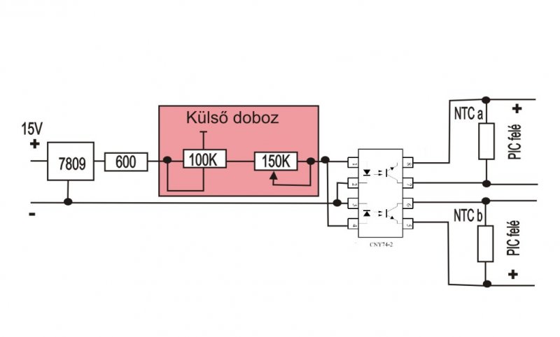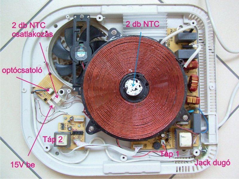 Az ötletet mindenki saját felelősségére alkalmazza! Az indukciós főzőlap nagyon jól bevált és tényleg takarékos. De van van egy nagy hibájuk a teljesítményt vagy hőmérsékletet csak lépcsőzetesen lehet állítani. Sok -féle típusú lap van a forgalomba ezért a leírás általános és felesleges ennél részletesebben leírni az átalakítást mert aki ebből nem érti meg az ne is kezdjen hozzá. A Mi 1800W-os lapunkba Pl: 5 fokozat van. 70-110-150-180-220C. A főzés akkor jó, ha éppen csak lassan forr a leves. A magas hőmérsékletnél kifut az étel és energia pazarlás is. Rajz persze nincs. Ki tudja, hogy működik a PIC. A tekercs közepén van két hőérzékelő NTC ellenállás 23C-on 105 K-omot mértem. A kiszerelt főpanel alján a két szenzor 4 pontjára vezetéket forrasztottam ami kivezettem a pót panelhez. Menet közben feszültség hidegen 4,5V a hőmérséklet emelkedésével csökken a feszültség a két hőérzékelőn. Azért szokott két párhuzamos két hőjeladó lenni, hogy az egyik meghibásodik akkor a PIC vészleállást csinál a további károk megelőzése érdekében. Csak úgy tudom analóggá tenni a hőmérséklet szabályozást ha a két hőellenállást szimmetrikusan sönt-ölöm mert a PIC 5 db komparátor feszültségét nem tudom befolyásolni. A készüléknek két 15V tápfeszültsége van az egyik a PIC-el együtt galvanikusan a hálózathoz van kötve! A másik 15V a nyomógombok utasításait optocsatolókon viszi a PIC-hez. A silány minőségű fólia tasztatúra másfél év után már repedezik és előre látó gondoskodás volt a gyenge minőség nyomógombokat hálózattól elválasztani. Én CNY74-2/74-4 típusú két utas analóg optocsatolót választottam. A nyomógomb külön Táp 2 :15V tápfeszültségére egy 9V-os stabilizátort tettem, utána meg egy 600ohmos ellenállást. Az optocsatoló két primer led diódáját párhuzamosan kötöttem, és egy kettős szigetelésű kábelen elvezettem egy dug aljzathoz, hátra. Ha véletlenül rövidre zárom akkor a két tranzisztor is rövidre zár azaz magas hőmérséklete érez a PIC. Semmilyen kár semmiben nem keletkezhet, csak hibaüzenettel leállítja a készüléket. A készülékünk olyan lekerekített lapos, hogy sehová nem tudtam a potmétert beépíteni azért szorultam erre a kábel, kis dobozos megoldásra. Erre a kivezetett pontra egy kábellel csatlakoztatott kis házba tettem egy 100k kalibráló trimert és a feleségnek egy 150komos lineáris potmétert. Ha kihúzzuk a csatlakozót olyan mintha ott se volna az átalakítás mert tranzisztorok ki vannak nyitva. A potméterekkel állítgatjuk hogyan lehet a hőmérsékletet befolyásolni lefelé. Én a kettes 110C fokozatot húzom lefelé, közben a két potméteren eső feszültségesésből ki lehet számítani hogyan lehet a leg-nyujtotabbá tenni a feleség potméterét. A kis panel alján jól látható a kikapart forr szem sor erre az hálózattól elválasztás biztonsága miatt szükség van. A készülék kikapcsolás után a le hűlésig járatja ventilátort, ezért kikapcsolás előtt a potmétereket ki kell kapcsolni, azaz ki húzni, mert a valóságnál melegebbnek érzi a PIC készüléket és esetleg nem áll le ventilátor. Az indukciós főzőlapok teljesítményét úgy változtatják, hogy maximális teljesítmény kitöltési tényezőjét változtatják. Tehát a beavatkozásunk után olyan módon változik meg ez a kitöltési tényező, hogy időnként rövid ideig picit forr, leves. Az átalakítás főzés technikába meghozta az elvárást, és energiát is fog megtakarítani, mert túl heves forrás haszontalanul gőz formájába megy veszendőbe. A fenti leírás megértéséhez az érintésvédelem ismerete szükséges! Az ötletet mindenki saját felelősségére alkalmazza! További tapasztalatok: Az indukciós főzőlap a fent leírt átalakítása nélkül is ha elromlik a készülékek alacsony ára és szervizek magas óradíja miatt szóba se jöhet készülék javítása, de mielőtt kidobnánk a készüléket a következő három dologra hívnám fel a figyelmet. Ellenőrizzük, hogy a hővezető paszta nem száradt e ki, mert Én másfél év után eléggé kiszáradtnak találtam. Ha két szenzor nem szimmetrikus hőt jelez máris hibát jelez a PIC. Tehát másfél évente a pasztát regeneráljuk. A szenzor hibát ki tudunk mérni, könnyen ki tudjuk cserélni. A hálózati oldalon egy nagy greacz híd egy nagy puffer 400V= kondit tölt. Győződjünk meg teljesítmény csökkenéskör ami nekem volt garancia idő alatt, a híd és kondi rendbe van-e. Ezeket egyszerűen mi is ki tudjuk cserélni. Ha mind Oké csak akkor kuka, illetve elektromos hulladék. A fenti leírás megértéséhez az érintésvédelem ismerete szükséges! Az ötletet mindenki saját felelősségére alkalmazza!