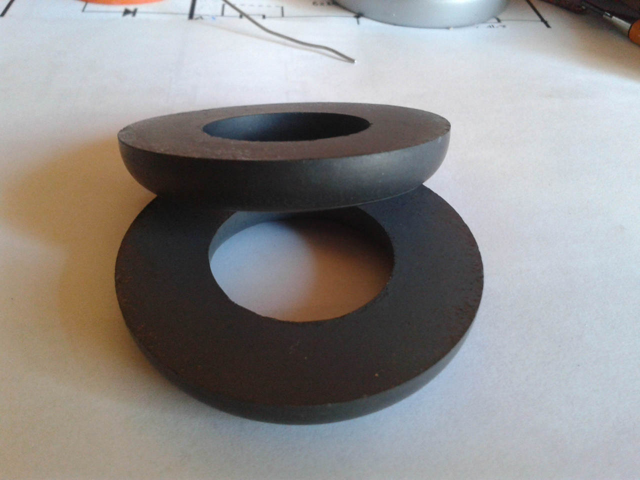 Megérkezett a ferrit mag 62 mm átmérőjű. Összefogassam valamivel a két felet (pl kötegelő) és legyen egy belőle vagy ekkora méretben a két fél is megfelelő két fojtónak.