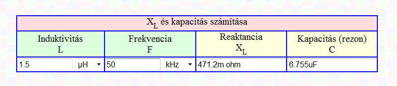 Egy kis számolási segítség kellene a pontos beállításokhoz. A mellékelt táblázatban beírtam a munkatekercs induktivitását és a mostani kHz-t. Erre kijött egy lehetséges kondibank méret 6.7 uF.