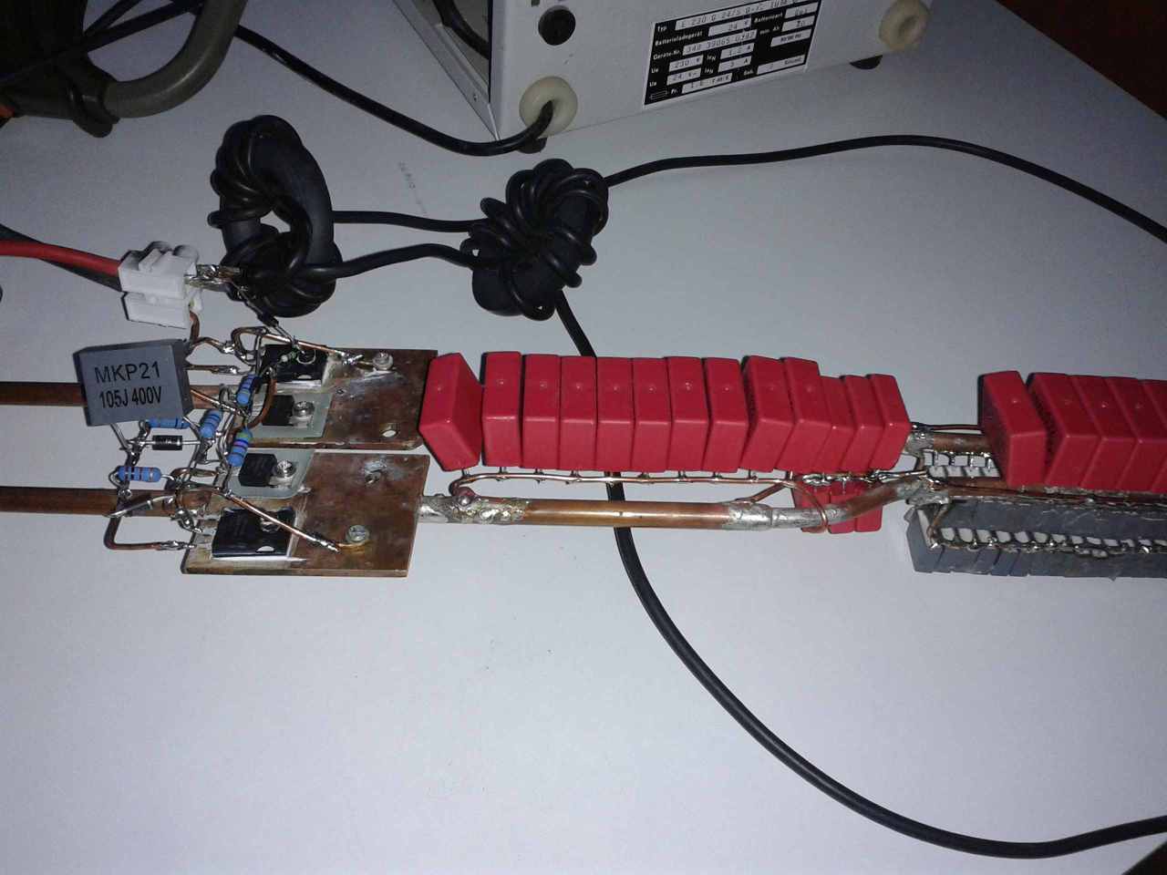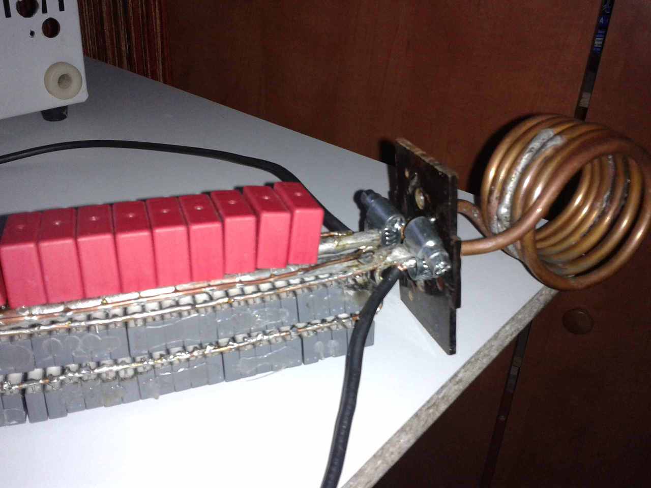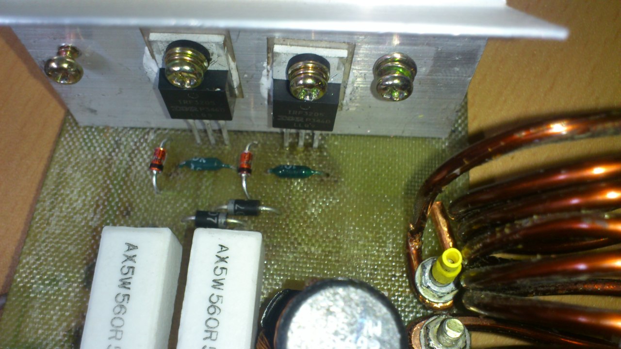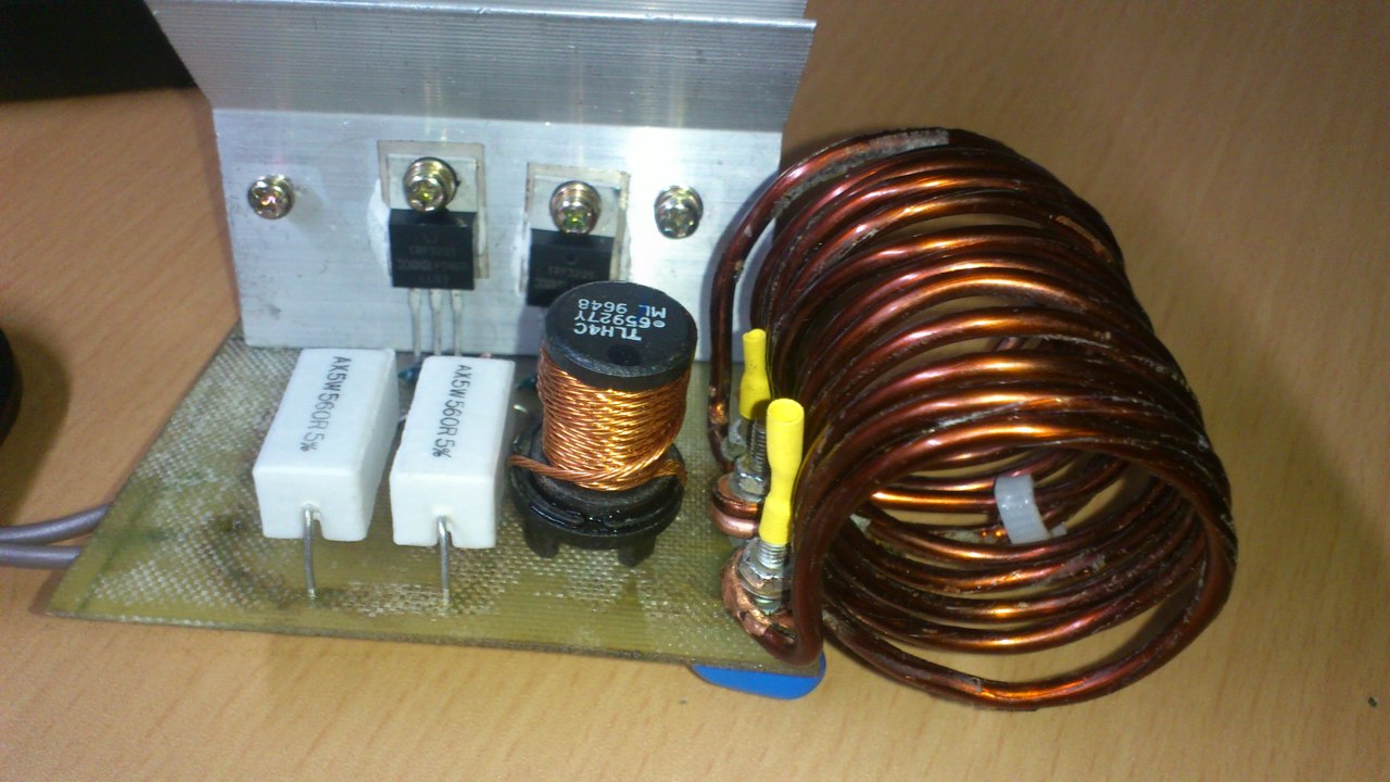 Megepitettem ezt a kapcsolast indukcios hevitokent. A valtoztatasok, IRF3205-ot hasznaltam. Annyi a problema vele, hogy a munkatekercs nagyon melegszik, jobban mint a hutoborda a tranzisztorokkal. A tekercs 2X6 menet 2.5-os rezdrotbol. 24V-rol mukodtettem.