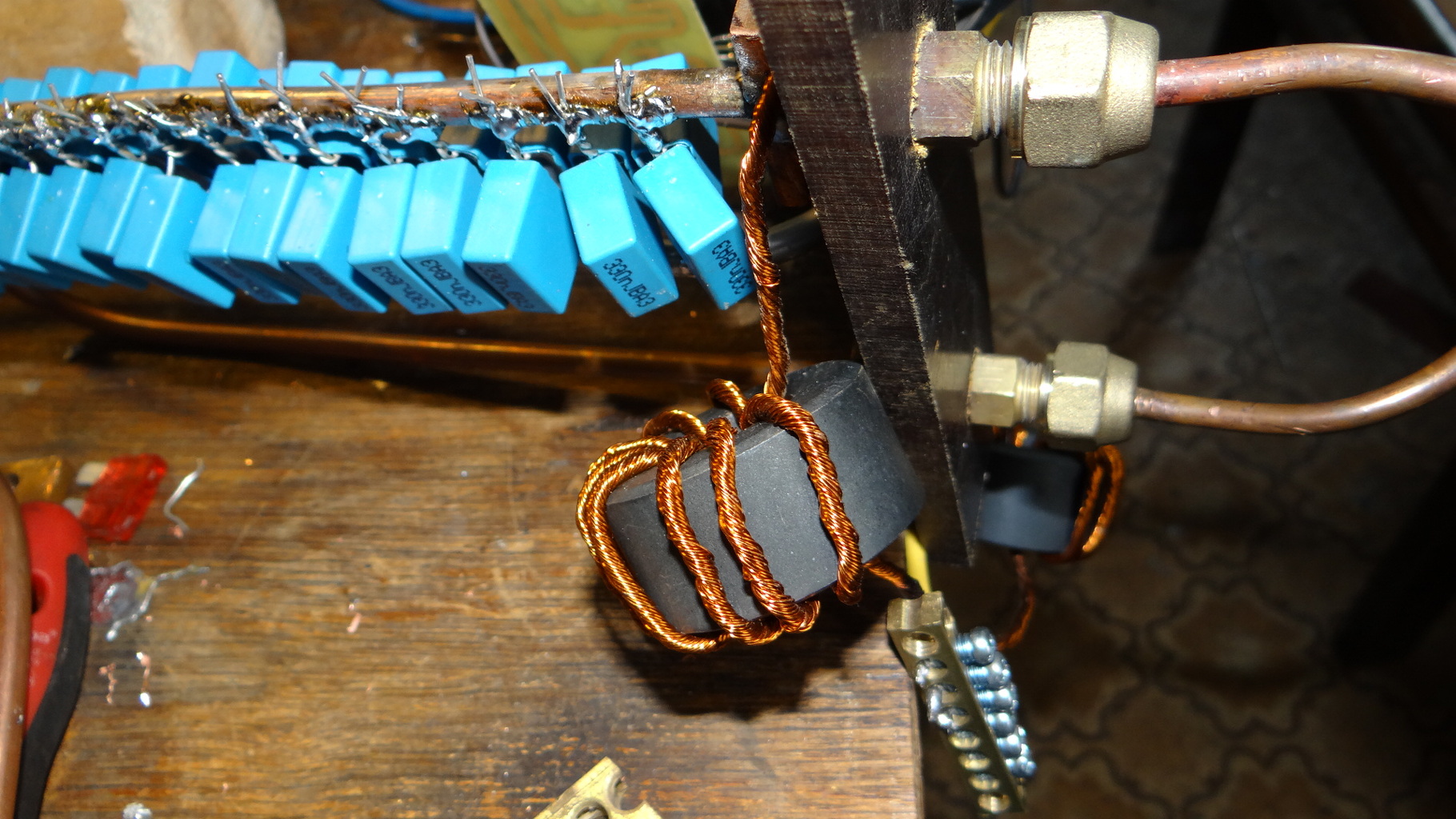 Mellékelek egy pár képet a szerkezetről. Visszaolvastam közben a fórumon, hogy lehet a kondibank bekötésem sem a megfelelő keresztmetszeten van. Egyszerűen annyira viszi a hőt a rézcső, hogy nem tudom közvetlen ráforrasztani a csőre és ha tudnám sem fér el úgy az összes.