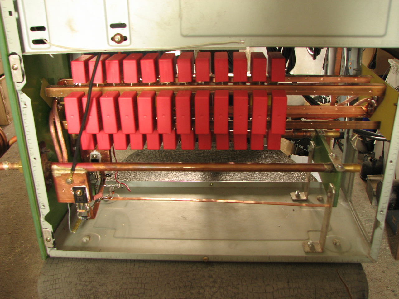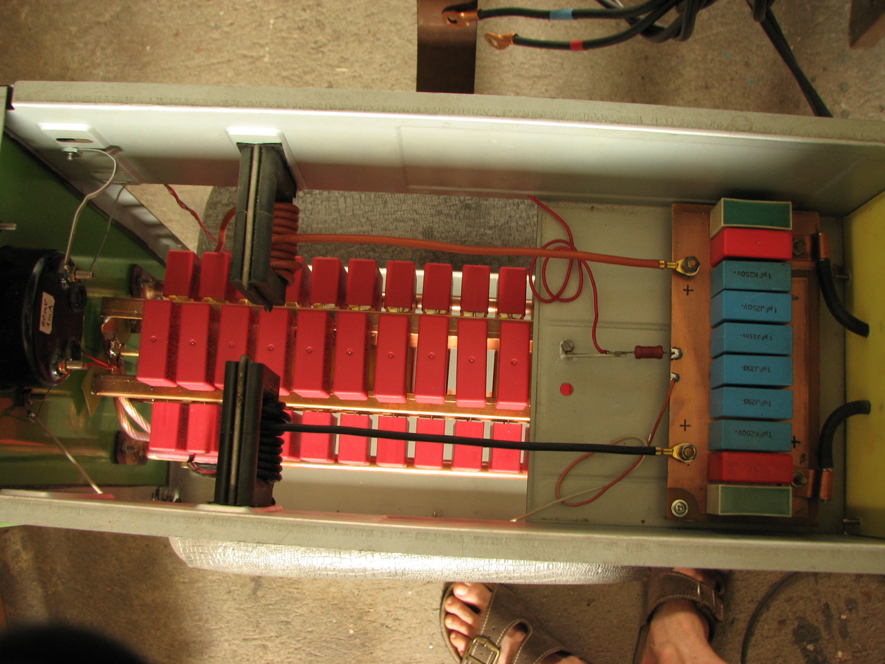 Az a kondi bank elrendezés szerintem nem a legjobb azt a kondi bankot be kéne raknod az a két cső közé ami kimegy a munkatekercshez.. Azokat a kondikat nagyon közel kell szerelni a munkatekercs FET drain részhéz.+ űgy látom nem is tudod hűteni a kondikat így max léghűtés.. A FET jó helyen van.A fojtók vezetéke is nagyon hosszú.