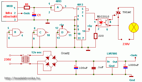 A vevőben nem vagyok 100% biztos, de mellékelem, hogy szerintem mi történik ott. Nézd meg>ezeket< (a TSOP kezdetűeket)! Egy ilyen van a vevő elején. A 3 lábból 2 a táp, a 3. pedig a kimenet, ami magasan/alacsonyan lesz. Egy ilyen ad impulzust a flip-flopnak, aminek a kimenete magasan vagy alacsonyan marad, hogy ki/be bekapcsolva tartson valamit. Az adót módosítani kell, hogy ezekhez jó legyen (a frekvencia miatt), de az 2db ellenállás és 1db kondenzátoron múlik. |