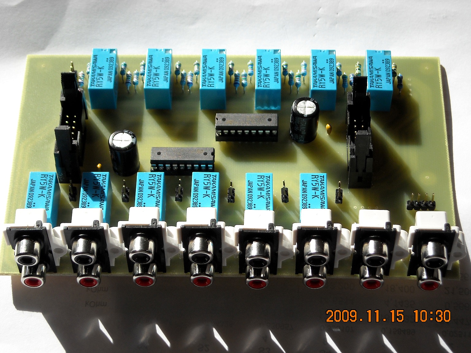 Nem. Az utolsó kettő, az kimenet. Az egyik közvetlenül a bemenetválasztóról jövő jelet adja ki (monitor), a másik összeköthető a hangerőszabályzó kimenetével. Itt meghagytam a lehetőséget, hogy egy műveleti erősítős rész (buffer, szintemelő, hangszínszabályzó, stb...) beköthető (közbeiktatható) legyen. Szerettem volna a 8 bemenetet és a 2 kimenetet, de sajna nem volt olyan széles panelom amin elfért volna. Mindegy, szerintem elég a 6 bemenet.