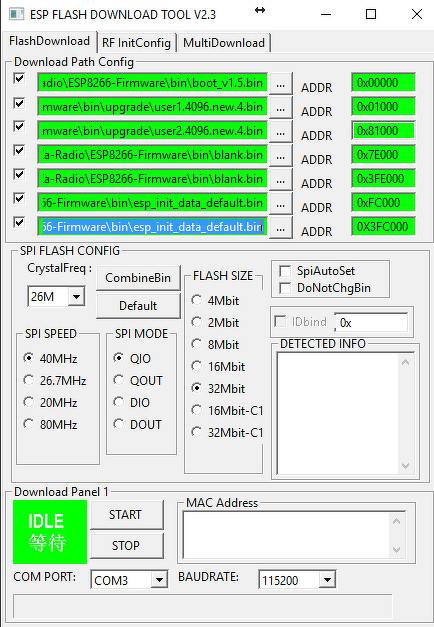Számítógépről én is Flash download tool v3.8.5-el programoztam fel. A KaRadio32.bin, az szerintem más fajta wifis chipphez van, nem az ESP8266-hoz. A sebességen nem tudom mit kell állítani, illetve milyen sebességet. A soros porté biztosan jó, mert írja olvassa, az hogy saját frissítésekor összeomlik, azzal nem tudok mit kezdeni. A download tool-al programozva, meg volt egy képernyő mentés, azt beállítgattam, a többit meg a chipből / vagy valahonnét kiolvassa, beállítja magának.