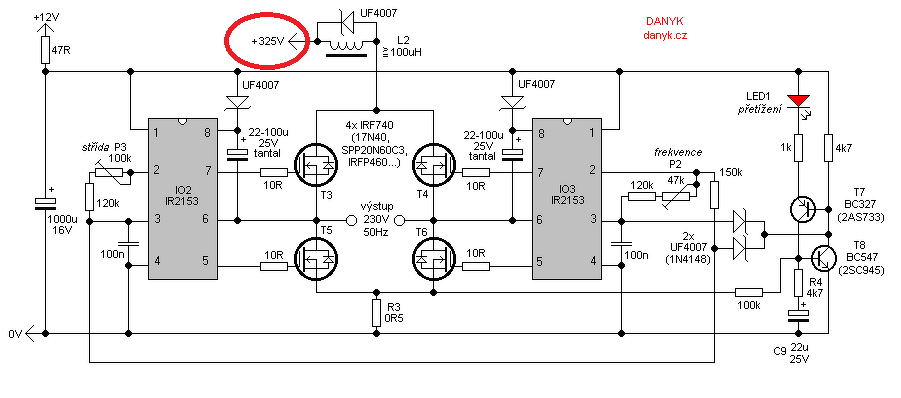 Azt szeretném kérdezni, hogy ha az alábbi rajzon a bekarikázott +325 V helyett, +60 V-os 20 kHz-es négyszögjelet kötnék akkor a H híd közepén beállítástól függően 42 V 50 Hz is lehet? Köszi előre is.