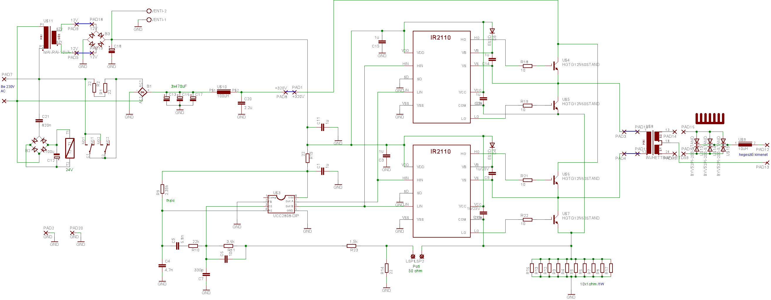 A trafója ETD59 a tekercsadatok: Primer 32menet ketté osztva 16 alul aztán 10menet szekunder és rajta a primer másik 16 menete! Ebből is látszik, hogy nem igazán jó ! A 10 menet szekundert csak vékony kábellel lehet megcsinálni ami viszont gyenge gépet eredményez! Vagy lemezzel kell megépíteni, de az ablak keresztmetszet kicsi egy erősebb géphez! Védelme nem jó, mert ha a végfoknak baja lesz az egész gép meghal a vezérléssel együtt! Persze ettől függetlenül TAB 120 kollégának még remekül működhet! Ez csak az én véleményem!