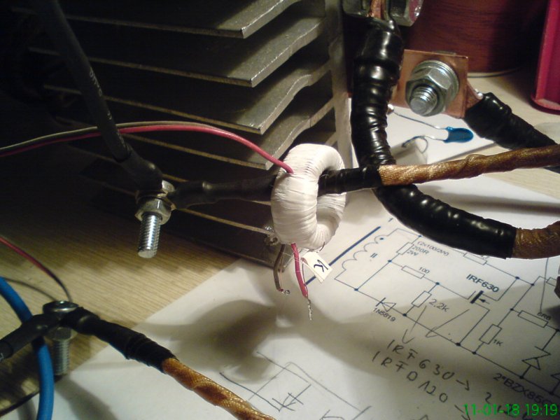 Ennek a magnak tökéletesen meg kell felelnie.Az eredeti orosz rajzon ennél kisebb fizikai méretű toroid van (szerintem,nálunk olyat égen-világon sem találnánk),anno sokan építettünk be a PC tápból kibontottat és semmi gond eddig nem volt ezekkel.Azt a nagy ferrit (???) magot egyáltalán nem javaslom.Miért van azon a toroidon,ha jól látom,dupla kivezetés?Közel van a bordához a nagyfesz csatlakozó összecsavarozva,nem lesz zárlat véletlen?Alatta látom a kapcsolási rajz egy részletét,de nem teljesen.Ezért még egyszer leírom,hogy a meghajtókörben IRFD120 fet van eredetileg és a G lehúzó ellenállása 1K,ha valaki Pl: IRF630 fetet épít be akkor a lehúzó ellenállás értéke 2,2k.Nehogy felcseréljétek ( ),mert pukk lesz a vége! Amikor én ezen utóbbi megoldással kísérleteztem,azt vettem észre,hogy a poti felcsavarásakor,kb. 1/3 állás után,éktelen visításba kezdett a vezérlő rész,az IGBT-k is bent voltak,rajt volt a nagyfesz is.Izzott pillanatok alatt minden,szerencsém volt,nem halt meg semmi.Aztán cseréltem az ellenállást és helyre állt a rend.