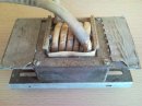 Bár a Macim még nincs teljesen kész, de időközben egy kedves visszatérő kollégám segítségével hozzájutottam néhány inverteres hegesztő apparát bontott anyaghoz. Állítása szerint (és én hiszek neki) egy párszáz amperos régi típusú Fronius készülékből származnak a "vasak". Ha minden igaz még tranzisztoros vezérléssel készült. Pontos típust sajnos nem tudok, a ferriten levő szám alapján a neten csak valami skandináv oldalon találtam egy Froniusos táblázatban utalást arra, hogy ez egy "Haupttransformator" (Ebből 2db van). A fojtó meg bár lemezes magból van de litzével van tekerve gyárilag.